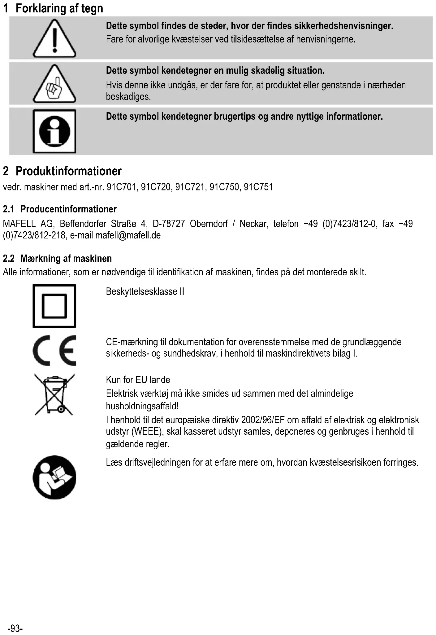 Generelle henvisninger: - Børn og unge må ikke betjene maskinen. Dette gælder ikke for unge i sammenhæng med en uddannelse, under opsyn af fagpersonale. - Du må aldrig arbejde med maskinen uden de foreskrevne beskyttelsesanordninger, du må ikke ændre sikkerhedsrelevante ting ved maskinen. - Ved udendørs brug af maskinen anbefales det at anvende et fejlstrømrelæ. - Beskadigede ledninger og stik skal udskiftes med det samme. Udskiftningen må kun gennemføres af-96- Mafell eller på et autoriseret MAFELL- kundeserviceværksted for at undgå sikkerhedsfarer. - Undgå skarpe knæk i ledningen. Især under transport og lagring af maskinen må ledningen ikke vikles omkring maskinen. - Tøj og hår skal bæres på en sådan måde, at det ikke kan komme i kontakt med fræseværktøjet og fræsespindlen. - Brug kun skarpe og ubeskadigede fræseværktøjer. Du opnår bedre overflader og reducerer faren for tilbageslag. - Kontroller, at fræseren sidder fast og at den kører fejlfrit, før den tages i brug. - Brug kun fræseværktøjer, der er godkendt til manuel fremføring. - Start først med at fræse i emnet, når fræseren har nået sit fulde omdrejningstal. - Sørg altid for, at tilslutningskablet er ført væk fra maskinen bagud under fræsearbejdet. - Fræs altid i modløb i forbindelse med bearbejdning af kanter med stort værktøj. - Læg først maskinen fra, efter den er blevet slukket, når fræseværktøjet står helt stille hhv. løsne klemningen til automatisk tilbageslag på maskinen og fastlås den igen. Henvisninger til brug af beskyttelsesudstyr: - Støjemissionen er større end 85 dB (A). Brug høreværn under arbejdet. - Brug altid beskyttelsesbriller under fræsearbejdet. - Brug en støvmaske for at forebygge sundhedsskader. Henvisninger vedr. drift: - Stik aldrig fingrene ind i fræseværktøjets arbejdsområde eller ind under grundpladen, når maskinen kører. - Hold godt fast i maskinen med begge hænder, før den tændes. - Sikr emnet mod at glide væk f.eks. med skruetvinger. - Fræserne skal skiftes rettidigt, da uskarpe fræsere ikke kun øger faren for tilbageslag, men også belaster motoren unødvendigt. Fræserne skal spændes som forklaret under 4.3. - Emnet kontrolleres for fremmedlegemer. Fræs ikke i metaldele f.eks. søm (fare for tilbageslag). - Træk netstikket ud før værktøjsskift, indstillingsarbejde og før afhjælpning af fejl (dette omfatter også fjernelse af fastklemte spåner). Henvisninger vedr. vedligeholdelse og reparation: - Den regelmæssige rensning af maskinen, især af justéranordningen og føringen, har en stor sikkerhedsmæssig betydning. - Der må udelukkende anvendes originale MAFELL- reservedele og tilbehør. I modsat fald ydes ingen garanti og producenten hæfter ikke for produktet. 4 Klargøring / indstilling