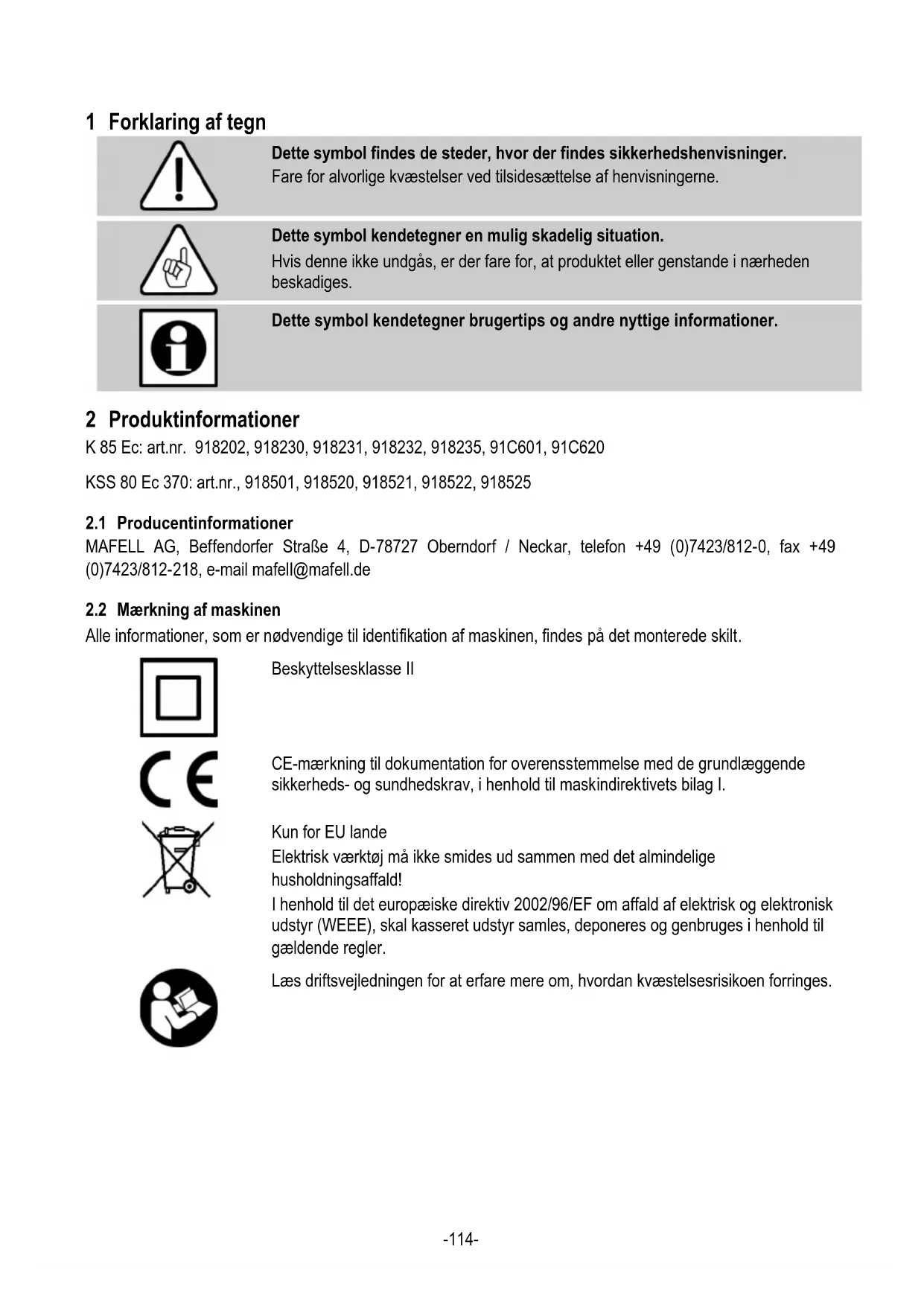 K 85 Ec / KSS 80 Ec er udelukkende egnet til længde- og tværsnit i massivt træ. Det er også muligt at bearbejde materiale som spånplader, møbelplader og mdf-plader. Anvend de godkendte savblade iht. EN 847-1. Det er også muligt at forarbejde træfiberisolationsmaterialer og plast (polystyren). Brug, som er i strid mod ovennævnte, er ikke tilladt. For en beskadigelse, som resulterer af sådan brug, er producenten ikke ansvarlig. Overhold drifts-, vedligeholdelses- og reparationsbestemmelserne fra Mafell, for at anvende maskinen efter formålet.
