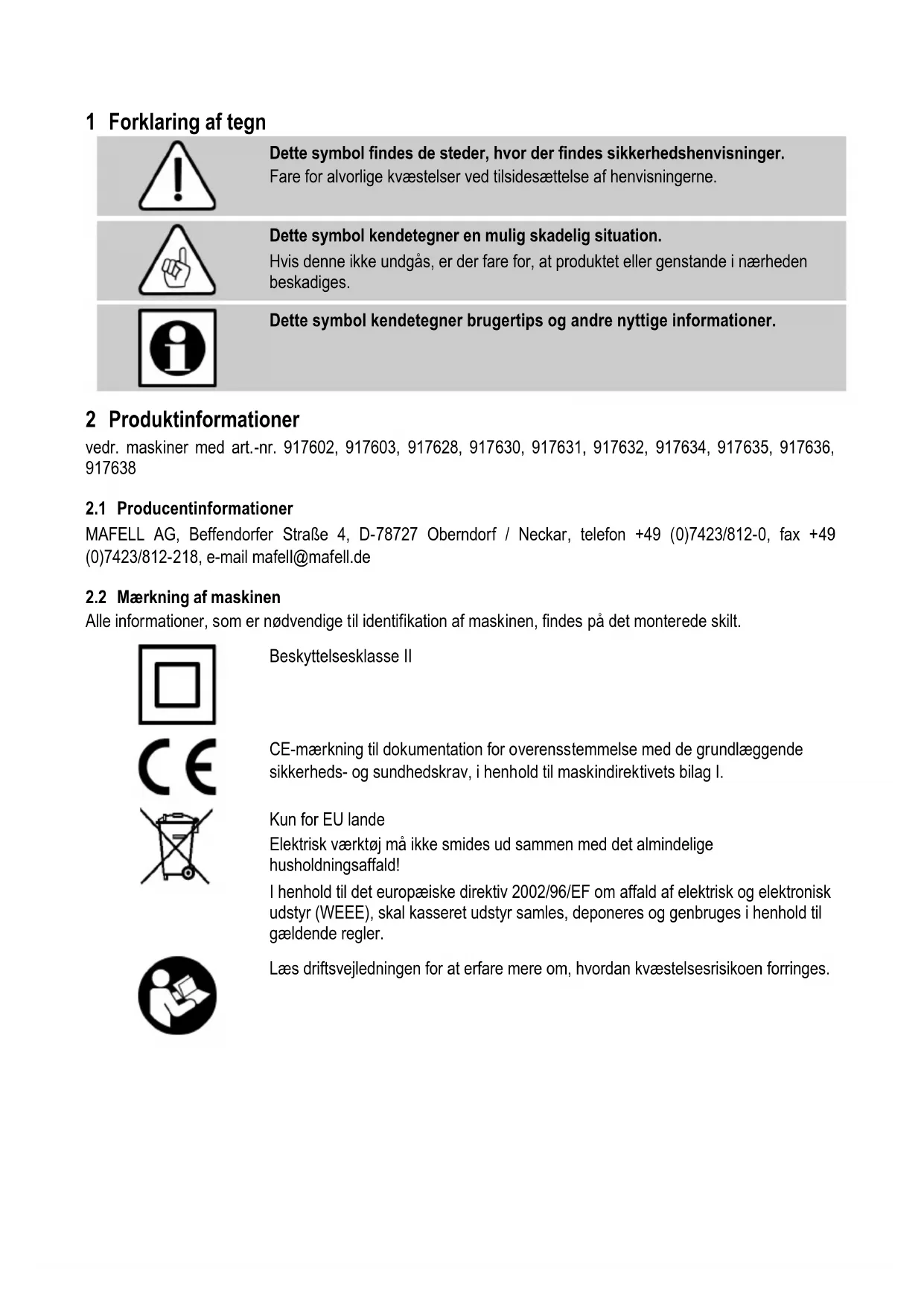 piktogrammer hertil se side 4. 6 Vedligeholdelse og reparation Fare Afbryd strømmen til maskinen og fjern el-stikket, før vedligeholdelse påbegyndes. MAFELL-maskiner er blevet konstrueret med henblik på mindst mulig vedligeholdelse. Kuglelejrene har livsvarig smøring. Efter længere tids drift anbefales det, at der udføres service på maskinen af på autoriseret Mafell-kundeservice værksted. Brug kun vores specielle fedtstof til alle smøresteder, ordre- nr. 049040 (1 kg - dåse).
