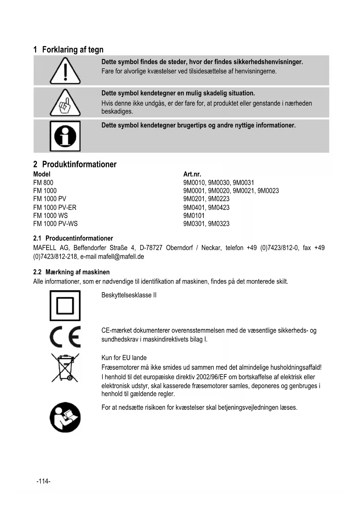 Generelle henvisninger: - Børn og unge må ikke betjene maskinen. Dette gælder ikke for unge i sammenhæng med en uddannelse, under opsyn af fagpersonale. - Arbejd aldrig uden portalsystemets beskyttelsesskærme, der er foreskrevet til det enkelte arbejde, og som fræsemotoren skal sættes ind i. Ændr intet på portalsystemet og på fræsemotoren, hvis det forringer sikkerheden. - Beskadigede ledninger og stik skal udskiftes med det samme. Udskiftningen må kun gennemføres af Mafell eller på et autoriseret MAFELL-kundeserviceværksted for at undgå sikkerhedsfarer. - Undgå skarpe knæk i ledningen. Især under transport og lagring af fræsemotoren må ledningen ikke vikles omkring fræsemotoren. - Det er forbudt at anvende vand eller ledende væsker under brug. - Det udelukkes, at fræsemotoren kan føres med hånden. - Hold fræsemotoren væk fra regn eller fugt. Hvis der trænger vand ind i fræsemotoren, øger det risikoen for elektrisk stød. Du må ikke anvende: - Beskadigede værktøjer og værktøjer, hvis form har ændret sig. - Uskarpe værktøjer på grund af den for høje motorbelastning. - Værktøjer, der ikke er egnet til fræsemotorens omdrejningstal i tomgang. Henvisninger til brug af beskyttelsesudstyr: - Brug altid høreværn under arbejdet med saven. - Brug altid en støvbeskyttelsesmaske under arbejdet med saven. - Brug altid beskyttelsesbriller under arbejdet. Henvisninger vedr. drift: - Undgå at hænderne kommer i nærheden af værktøjets farlige område. - Kontrollér emnet for fremmedelementer. - Overvåg omdrejningstallet. Øges omdrejningstallet ukontrolleret, opstår et omdrejningstalspring, skal spændingsforsyningen slukke med det samme.-118- Henvisninger vedr. vedligeholdelse og reparation: - Den regelmæssige rengøring af fræsemotoren er en vigtig sikkerhedsfaktor - Der må udelukkende anvendes originale reservedele og originalt tilbehør fra MAFELL. I modsat fald bortfalder garantien, og producenten hæfter ikke for produktet. 4 Klargøring / indstilling