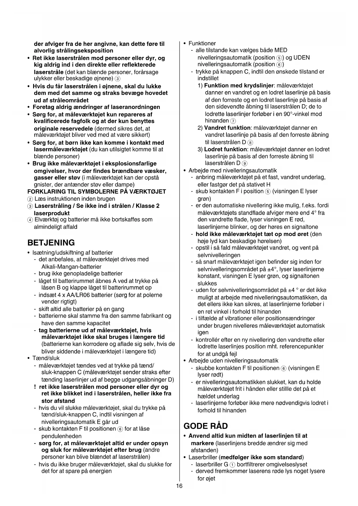 - Brug ikke måleværktøjet i eksplosionsfarlige omgivelser, hvor der findes brændbare væsker, gasser eller støv (i måleværktøjet kan der opstå gnister, der antænder støv eller dampe) FORKLARING TIL SYMBOLERNE PÅ VÆRKTØJET 2 Læs instruktionen inden brugen 3 Laserstråling / Se ikke ind i strålen / Klasse 2 laserprodukt 4 Elværktøj og batterier må ikke bortskaes som almindeligt aald BETJENING