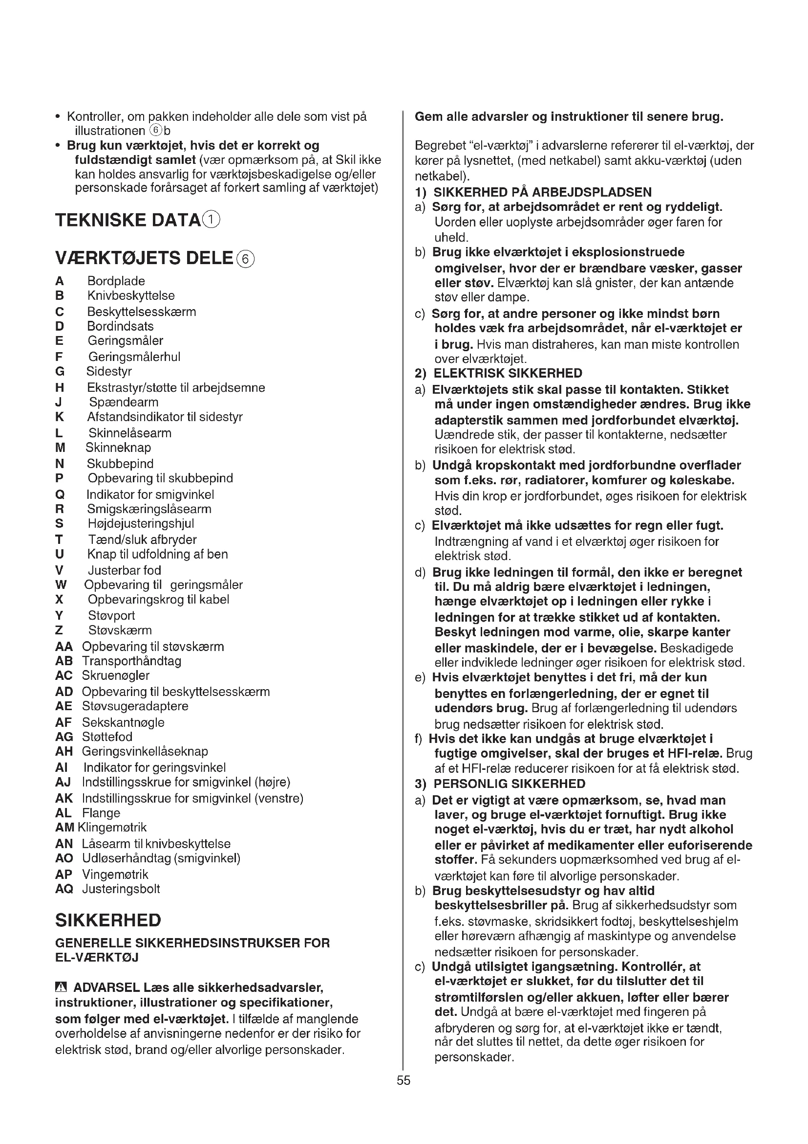 A Bordplade B Knivbeskyttelse C Beskyttelsesskærm D Bordindsats E Geringsmåler F Geringsmålerhul G Sidestyr H Ekstrastyr/støtte til arbejdsemne J Spændearm K Afstandsindikator til sidestyr L Skinnelåsearm M Skinneknap N Skubbepind P Opbevaring til skubbepind Q Indikator for smigvinkel R Smigskæringslåsearm S Højdejusteringshjul T Tænd/sluk afbryder U Knap til udfoldning af ben V Justerbar fod W Opbevaring til geringsmåler X Opbevaringskrog til kabel Y Støvport Z Støvskærm AA Opbevaring til støvskærm AB Transporthåndtag AC Skruenøgler AD Opbevaring til beskyttelsesskærm AE Støvsugeradaptere AF Sekskantnøgle AG Støttefod AH Geringsvinkellåseknap AI Indikator for geringsvinkel AJ Indstillingsskrue for smigvinkel (højre) AK Indstillingsskrue for smigvinkel (venstre) AL Flange AM Klingemøtrik AN Låsearm til knivbeskyttelse AO Udløserhåndtag (smigvinkel) AP Vingemøtrik AQ Justeringsbolt SIKKERHED