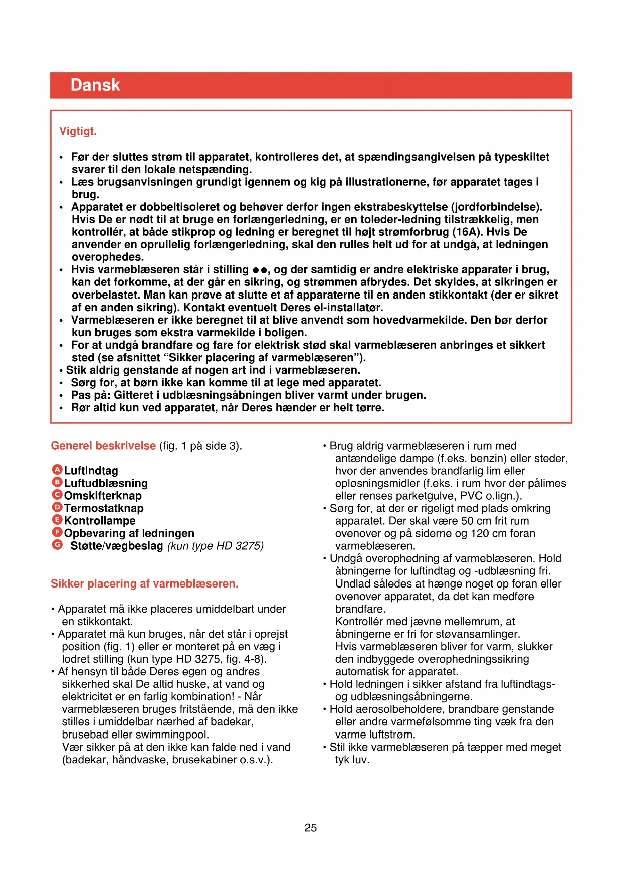 Så snart rumtemperaturen igen er oppe på det ønskede, slukker apparatet. Man opnår højere temperatur ved at dreje termostatknappen venstre om og lavere temperatur ved at dreje den højre om. De må gerne ændre termostat-instillingen, medens apparatet er i brug. Sådan findes den ideelle termostatindstilling: - Sæt først termostatknappen i maksimum stilling (drej den venstre om til den ikke kan komme længere). - Når den ønskede temperatur er nået, drejes termostatknappen langsomt højre om til det punkt, hvor varmeblæseren slår fra. y = “Frostfri stilling”. Denne stilling svarer til, at termostatknappen er sat i minimum-stilling (ca. +5 °C) og kan bruges til at holde området i umiddelbar nærhed af apparatet frostfrit, f.eks. hvis man vil forhindre, at et vandrør fryser til. Anbring varmeblæseren tæt på vandrøret og vælg den frostfri stilling. Bemærk: Hvis der vælges kold luft-stilling >, skal termostatknappen være drejet til maksimum stilling (helt venstre om). Kontrollampe. - Når der er sat strøm på varmeblæseren og tændt for en af knapperne >, 1 eller 2, lyser kontrollampen (E). - Lampen bliver ved med at lyse, indtil der slukkes for apparatet ved at sætte omskifterknappen (C) i stilling O eller ved at slukke for strømmen til apparatet. - For at indikere at der stadig er strøm på varmeblæseren og tændt for den (>, 1 eller 2), lyser kontrollampen stadig selvom den ønskede temperatur er nået, og termostatknappen har slukket for apparatet. Af samme grund lyser kontrollampen også fortsat, selvom sikkerhedsanordningen mod overophedning har slukket for varmeblæseren. Overophedningssikring. For at undgå beskadigelse og risiko i forbindelse med overophedning, afbryder den indbyggede overophedningssikring for strømmen til varmeblæseren i samme øjeblik, varmelegemerne bliver for varme. Hvis dette indtræffer, gøres følgende: - Kontrollér først, at det ikke er termostaten, der har afbrudt for strømmen til apparatet. Drej termostatknappen til maksimum stilling. Hvis varmeblæseren ikke går i gang, er det overophedningssikringen, der har afbrudt apparatet. - Tag stikket ud af stikkontakten. - Lad varmeblæseren køle af i 30 minutter. - Kontrollér, at De har placeret apparatet korrekt. - Kontrollér, om der er noget, der blokerer for luftstrømmen. Om nødvendigt renses luftindtags- og udblæsningsgitrene med en støvsuger. - Sæt stikket i stikkontakten og tænd for varmeblæseren igen. Hvis overophedningssikringen igen afbryder for varmeblæseren: - Tag stikket ud af stikkontakten. - Aflevér apparatet til eftersyn, enten til forhandleren eller direkte til Philips. Rengøring. - Sluk for apparatet ved at sætte omskifterknappen (C) i stilling O. - Tag stikket ud af stikkontakten. - Vent derefter til varmeblæseren er kølet tilstrækkeligt af. - Udvendigt kan apparatet rengøres med en fugtig klud. Sørg for, at der aldrig kommer vand ind i apparatet. - Åbningerne til luftindtag og - udblæsning rengøres regelmæssigt (mindst 2 gange om året ved normal brug af apparatet) ved hjælp af en støvsuger med børstemundstykke.28 Generell beskrivelse (fig. 1 side 3) A Luftinntaksåpning B Utblåsingsåpning C Velgerbryter D Termostatknapp E Indikatorlampe F Oppbevaringsplass for ledning G Stativ/veggbrakett (bare for type HD 3275) Sikker plassering