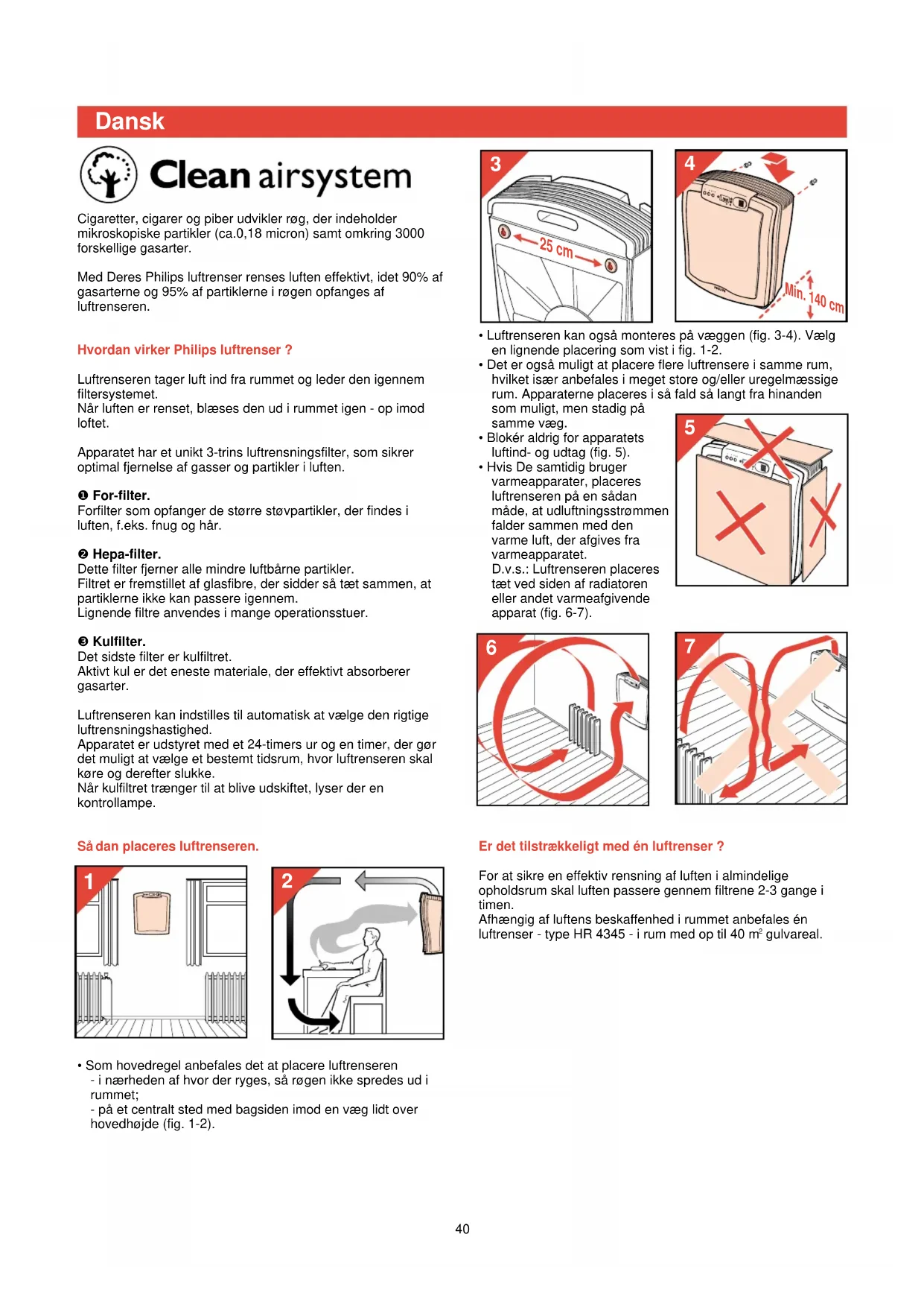 46• Luftrenseren kan også monteres på væggen (fig. 3-4). Vælgen lignende placering som vist i fig. 1-2.• Det er også muligt at placere flere luftrensere i samme rum,hvilket især anbefales i meget store og/eller uregelmæssigerum. Apparaterne placeres i så fald så langt fra hinandensom muligt, men stadig påsamme væg.• Blokér aldrig for apparatetsluftind- og udtag (fig. 5).• Hvis De samtidig brugervarmeapparater, placeresluftrenseren på en sådanmåde, at udluftningsstrømmenfalder sammen med denvarme luft, der afgives fravarmeapparatet.D.v.s.: Luftrenseren placerestæt ved siden af radiatoreneller andet varmeafgivendeapparat (fig. 6-7).Er det tilstrækkeligt med én luftrenser ?For at sikre en effektiv rensning af luften i almindeligeopholdsrum skal luften passere gennem filtrene 2-3 gange itimen.Afhængig af luftens beskaffenhed i rummet anbefales énluftrenser - type HR 4345 - i rum med op til 40 m gulvareal.Cigaretter, cigarer og piber udvikler røg, der indeholdermikroskopiske partikler (ca.0,18 micron) samt omkring 3000forskellige gasarter.Med Deres Philips luftrenser renses luften effektivt, idet 90% afgasarterne og 95% af partiklerne i røgen opfanges afluftrenseren. Hvordan virker Philips luftrenser ?Luftrenseren tager luft ind fra rummet og leder den igennemfiltersystemet.Når luften er renset, blæses den ud i rummet igen - op imodloftet.Apparatet har et unikt 3-trins luftrensningsfilter, som sikreroptimal fjernelse af gasser og partikler i luften.❶ For-filter.Forfilter som opfanger de større støvpartikler, der findes iluften, f.eks. fnug og hår.❷ Hepa-filter.Dette filter fjerner alle mindre luftbårne partikler.Filtret er fremstillet af glasfibre, der sidder så tæt sammen, atpartiklerne ikke kan passere igennem.Lignende filtre anvendes i mange operationsstuer.❸ Kulfilter.Det sidste filter er kulfiltret.Aktivt kul er det eneste materiale, der effektivt absorberergasarter.Luftrenseren kan indstilles til automatisk at vælge den rigtigeluftrensningshastighed.Apparatet er udstyret med et 24-timers ur og en timer, der gørdet muligt at vælge et bestemt tidsrum, hvor luftrenseren skalkøre og derefter slukke.Når kulfiltret trænger til at blive udskiftet, lyser der enkontrollampe.Sådan placeres luftrenseren.• Som hovedregel anbefales det at placere luftrenseren- i nærheden af hvor der ryges, så røgen ikke spredes ud irummet;- på et centralt sted med bagsiden imod en væg lidt overhovedhøjde (fig. 1-2). Dansk