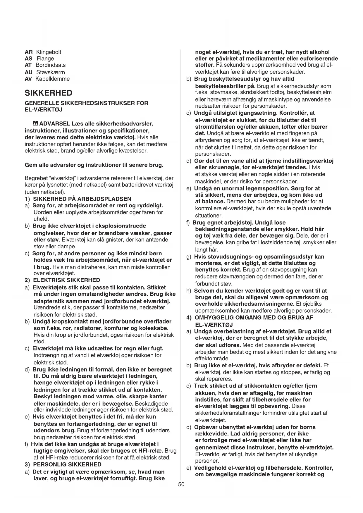 a) Undgå overbelastning af el-værktøjet. Brug altid et el-værktøj, der er beregnet til det stykke arbejde, der skal udføres. Med det passende el-værktøj arbejder man bedst og mest sikkert inden for det angivne eektområde. b) Brug ikke et el-værktøj, hvis afbryder er defekt. Et el-værktøj, der ikke kan startes og stoppes, er farlig og skal repareres. c) Træk stikket ud af stikkontakten og/eller fjern akkuen, hvis den er aftagelig, før maskinen indstilles, før skift af tilbehørsdele eller før el-værktøjet lægges til opbevaring. Disse sikkerhedsforanstaltninger forhindrer utilsigtet start af el-værktøjet. d) Opbevar ubenyttet el-værktøj uden for børns rækkevidde. Lad aldrig personer, der ikke er fortrolige med el-værktøjet eller ikke har gennemlæst disse instrukser, benytte el-værktøjet. El-værktøj er farligt, hvis det benyttes af ukyndige personer. e) Vedligehold el-værktøj og tilbehørsdele. Kontroller, om bevægelige maskindele fungerer korrekt og AR Klingebolt AS Flange AT Bordindsats AU Støvskærm AV Kabelklemme SIKKERHED
