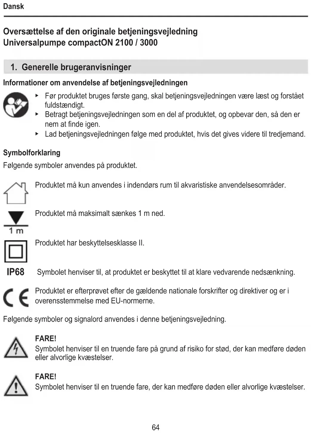 Informationer om anvendelse af betjeningsvejledningen ▶ Før produktet bruges første gang, skal betjeningsvejledningen være læst og forstået fuldstændigt. ▶ Betragt betjeningsvejledningen som en del af produktet, og opbevar den, så den er nem at nde igen. ▶ Lad betjeningsvejledningen følge med produktet, hvis det gives videre til tredjemand. Symbolforklaring Følgende symboler anvendes på produktet. Produktet må kun anvendes i indendørs rum til akvaristiske anvendelsesområder. Produktet må maksimalt sænkes 1 m ned. Produktet har beskyttelsesklasse II. Symbolet henviser til, at produktet er beskyttet til at klare vedvarende nedsænkning. Produktet er efterprøvet efter de gældende nationale forskrifter og direktiver og er i overensstemmelse med EU-normerne. Følgende symboler og signalord anvendes i denne betjeningsvejledning. FARE! Symbolet henviser til en truende fare på grund af risiko for stød, der kan medføre døden eller alvorlige kvæstelser. FARE! Symbolet henviser til en truende fare, der kan medføre døden eller alvorlige kvæstelser. IP68Dansk