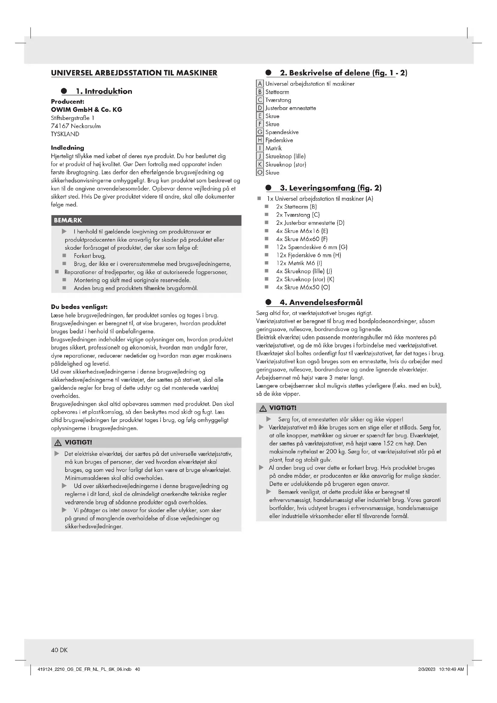 VIGTIGT! u Sørg for, at emnestøtten står sikker og ikke vipper! u Værktøjsstativet må ikke bruges som en stige eller et stillads. Sørg for, at alle knopper, møtrikker og skruer er spændt før brug. Elværktøjet, der sættes på værktøjsstativet, må højst være 152 cm højt. Den maksimale nyttelast er 200 kg. Sørg for, at værktøjsstativet står på et plant, fast og stabilt gulv. u Al anden brug ud over dette er forkert brug. Hvis produktet bruges på andre måder, er producenten er ikke ansvarlig for mulige skader. Dette er udelukkende på brugeren egen ansvar. u Bemærk venligst, at dette produkt ikke er beregnet til erhvervsmæssigt, handelsmæssigt eller industrielt brug. Vores garanti bortfalder, hvis udstyret bruges i erhvervsmæssige, handelsmæssige eller industrielle virksomheder eller til tilsvarende formål. 419124_2210_OS_DE_FR_NL_PL_SK_06.indb 40419124_2210_OS_DE_FR_NL_PL_SK_06.indb 40 2/3/2023 10:10:49 AM2/3/2023 10:10:49 AM41DK