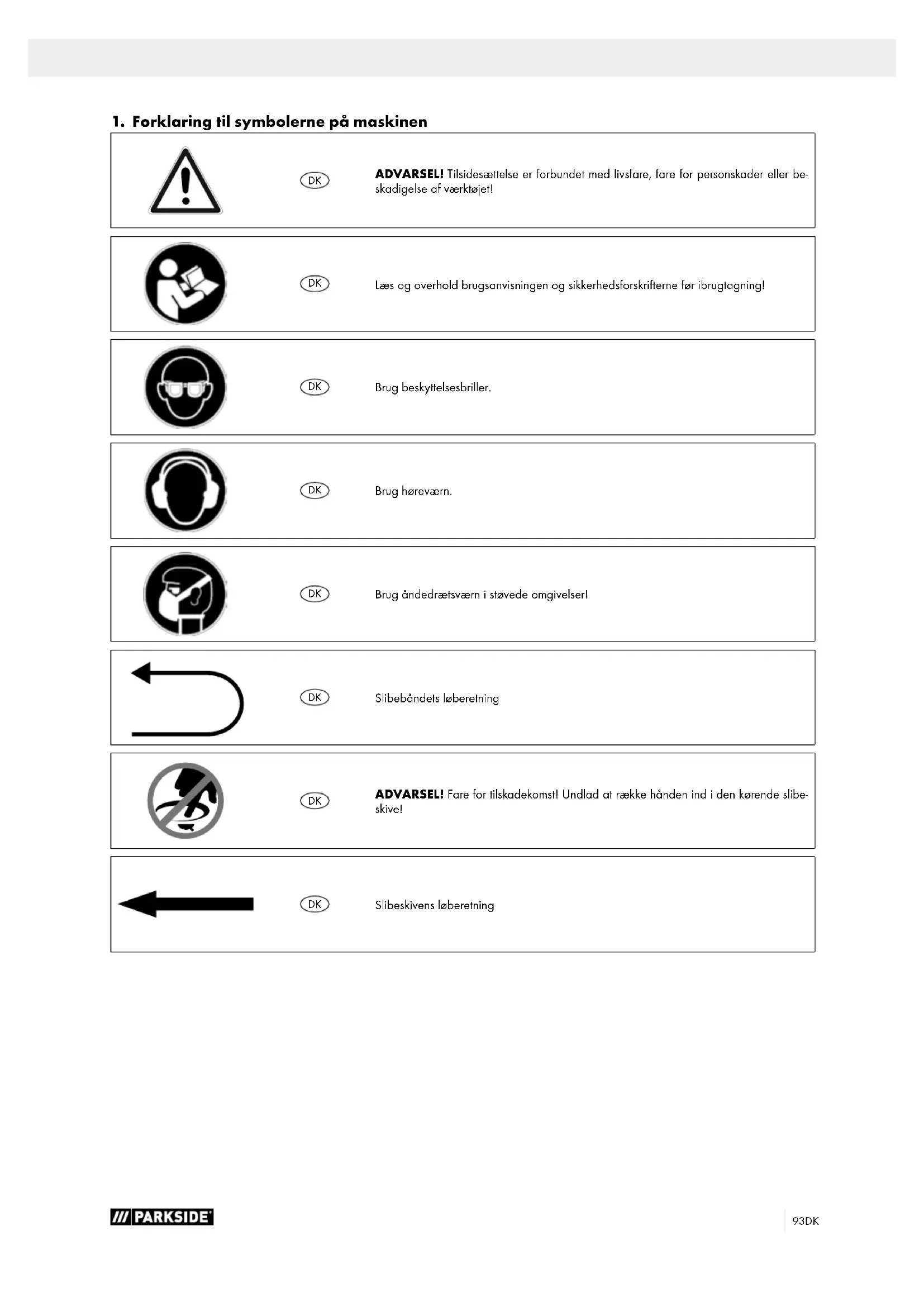 ADVARSEL! Fare for tilskadekomst! Undlad at række hånden ind i den kørende slibe- skive!