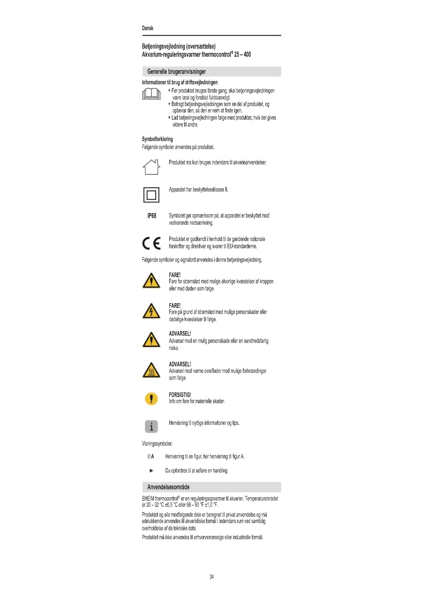 25 – 400 Generelle brugeranvisninger Informationer til brug af driftsvejledningen ▶ Før produktet bruges første gang, skal betjeningsvejledningen være læst og forstået fuldstændigt. ▶ Betragt betjeningsvejledningen som en del af produktet, og opbevar den, så den er nem at nde igen. ▶ Lad betjeningsvejledningen følge med produktet, hvis det gives videre til andre. Symbolforklaring Følgende symboler anvendes på produktet. Produktet må kun bruges indendørs til akvarieanvendelser. Apparatet har beskyttelsesklasse II. Symbolet gør opmærksom på, at apparatet er beskyttet mod vedvarende nedsænkning. Produktet er godkendt i henhold til de gældende nationale forskrifter og direktiver og svarer til EU-standarderne. Følgende symboler og signalord anvendes i denne betjeningsvejledning. FARE! Fare for strømstød med mulige alvorlige kvæstelser af kroppen eller med døden som følge. FARE! Fare på grund af strømstød med mulige personskader eller dødelige kvæstelser til følge. ADVARSEL! Advarsel mod en mulig personskade eller en sundhedsfarlig risiko. ADVARSEL! Advarsel mod varme overader med mulige forbrændinger som følge. FORSIGTIG! Info om fare for materielle skader. Henvisning til nyttige informationer og tips. Visningssymboler: Henvisning til en gur, her henvisning til gur A. Du opfordres til at udføre en handling. IP68
