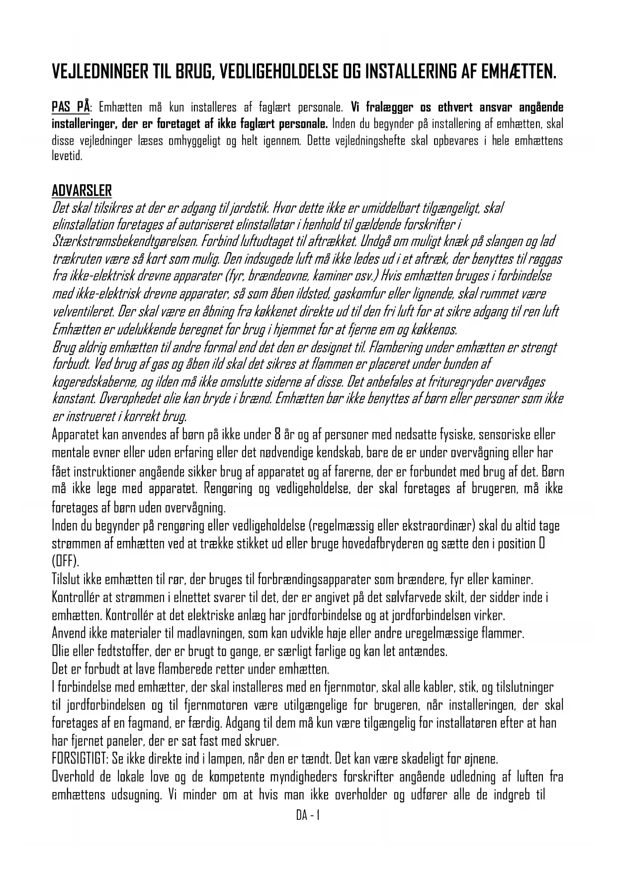 FRDA - 1 VEJLEDNINGER TIL BRUG, VEDLIGEHOLDELSE OG INSTALLERING AF EMHÆTTEN. PAS PÅ: Emhætten må kun installeres af faglært personale. Vi fralægger os ethvert ansvar angående installeringer, der er foretaget af ikke faglært personale. Inden du begynder på installering af emhætten, skal disse vejledninger læses omhyggeligt og helt igennem. Dette vejledningshefte skal opbevares i hele emhættens levetid. ADVARSLER Det skal tilsikres at der er adgang til jordstik. Hvor dette ikke er umiddelbart tilgængeligt, skal elinstallation foretages af autoriseret elinstallatør i henhold til gældende forskrifter i Stærkstrømsbekendtgørelsen. Forbind luftudtaget til aftrækket. Undgå om muligt knæk på slangen og lad trækruten være så kort som mulig. Den indsugede luft må ikke ledes ud i et aftræk, der benyttes til røggas fra ikke-elektrisk drevne apparater (fyr, brændeovne, kaminer osv.) Hvis emhætten bruges i forbindelse med ikke-elektrisk drevne apparater, så som åben ildsted, gaskomfur eller lignende, skal rummet være velventileret. Der skal være en åbning fra køkkenet direkte ud til den fri luft for at sikre adgang til ren luft Emhætten er udelukkende beregnet for brug i hjemmet for at fjerne em og køkkenos. Brug aldrig emhætten til andre formal end det den er designet til. Flambering under emhætten er strengt forbudt. Ved brug af gas og åben ild skal det sikres at flammen er placeret under bunden af kogeredskaberne, og ilden må ikke omslutte siderne af disse. Det anbefales at frituregryder overvåges konstant. Overophedet olie kan bryde i brænd. Emhætten bør ikke benyttes af børn eller personer som ikke er instrueret i korrekt brug. Apparatet kan anvendes af børn på ikke under 8 år og af personer med nedsatte fysiske, sensoriske eller mentale evner eller uden erfaring eller det nødvendige kendskab, bare de er under overvågning eller har fået instruktioner angående sikker brug af apparatet og af farerne, der er forbundet med brug af det. Børn må ikke lege med apparatet. Rengøring og vedligeholdelse, der skal foretages af brugeren, må ikke foretages af børn uden overvågning. Inden du begynder på rengøring eller vedligeholdelse (regelmæssig eller ekstraordinær) skal du altid tage strømmen af emhætten ved at trække stikket ud eller bruge hovedafbryderen og sætte den i position 0 (OFF). Tilslut ikke emhætten til rør, der bruges til forbrændingsapparater som brændere, fyr eller kaminer. Kontrollér at strømmen i elnettet svarer til det, der er angivet på det sølvfarvede skilt, der sidder inde i emhætten. Kontrollér at det elektriske anlæg har jordforbindelse og at jordforbindelsen virker. Anvend ikke materialer til madlavningen, som kan udvikle høje eller andre uregelmæssige flammer. Olie eller fedtstoffer, der er brugt to gange, er særligt farlige og kan let antændes. Det er forbudt at lave flamberede retter under emhætten. I forbindelse med emhætter, der skal installeres med en fjernmotor, skal alle kabler, stik, og tilslutninger til jordforbindelsen og til fjernmotoren være utilgængelige for brugeren, når installeringen, der skal foretages af en fagmand, er færdig. Adgang til dem må kun være tilgængelig for installatøren efter at han har fjernet paneler, der er sat fast med skruer. FORSIGTIGT: Se ikke direkte ind i lampen, når den er tændt. Det kan være skadeligt for øjnene. Overhold de lokale love og de kompetente myndigheders forskrifter angående udledning af luften fra emhættens udsugning. Vi minder om at hvis man ikke overholder og udfører alle de indgreb tilDA - 2 vedligeholdelse og rengøring, der er angivet i dette hefte, er der alvorlig fare for brand. PAS PÅ: De dele, man kan komme i berøring med, kan blive varme når emhætten bruges med madlavningsapparater. INSTALLERING Den mindste sikkerhedsafstand fra emhættens nederste plan til kogeplanet skal være på 65 cm; mindre afstande skal udelukkende autoriseres af fabrikanten (jf. installeringstegninger). Emhætten kan anvendes både i filtrerende og udsugende funktion. Ved filtrerende funktion, dvs. når luften sendes i cirkulation igen, skal man anvende kulfiltre (jf. paragraf KULFILTRE). Ved udsugende funktion, dvs. ved udblæsning udendørs af den filtrerede luft, er det nødvendigt at have et passende kompenseringssystem i overensstemmelse med de gældende love. Røgens udblæsningsrør skal have den samme diameter eller være større end den, der er i emhættens tilslutning. Lokalet, hvor emhætten installeres, skal have tilstrækkelig ventilation, når der samtidig anvendes andre apparater der bruger gas eller andre brændstoffer. Emhætter indrettet til fjernmotor Emhætter, der er indrettet til fjernmotor, er udstyret med et stik til tilslutning til fjernmotorens kabel. Dette stik sidder inde i emhætten. Sæt fjernmotorens kabel ind i emhætten gennem åbningen i emhætten (sædvanligvis ved siden af hullet til røg/damp udblæsningen) og forbind de to stik med hinanden. For at gøre dette, skal man følge tegningerne i vejledningsheftet til fjernmotoren. Emhætter uden motor (Art.*0***) må kun installeres og tilsluttes til den udsugeenhed, der leveres og angives af fabrikanten med max kraft på 690W. I forbindelse med emhætter, der skal installeres med en fjernmotor, skal alle kabler, stik, og tilslutninger til jordforbindelsen og til fjernmotoren være utilgængelige for brugeren, når installeringen, der skal foretages af en fagmand, er færdig. Adgang til dem må kun være tilgængelig for installatøren efter at han har fjernet paneler, der er sat fast med skruer.