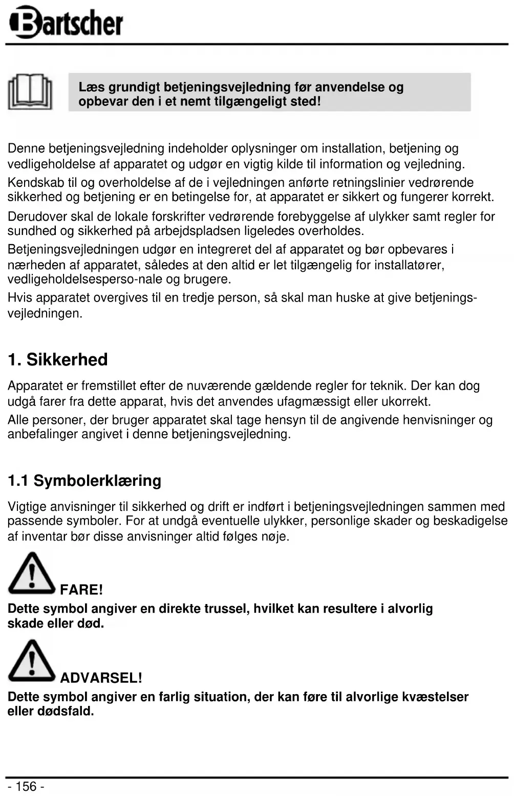 Vigtige anvisninger til sikkerhed og drift er indført i betjeningsvejledningen sammen med passende symboler. For at undgå eventuelle ulykker, personlige skader og beskadigelse af inventar bør disse anvisninger altid følges nøje. FARE! Dette symbol angiver en direkte trussel, hvilket kan resultere i alvorlig skade eller død. ADVARSEL! Dette symbol angiver en farlig situation, der kan føre til alvorlige kvæstelser eller dødsfald.- 157 -
