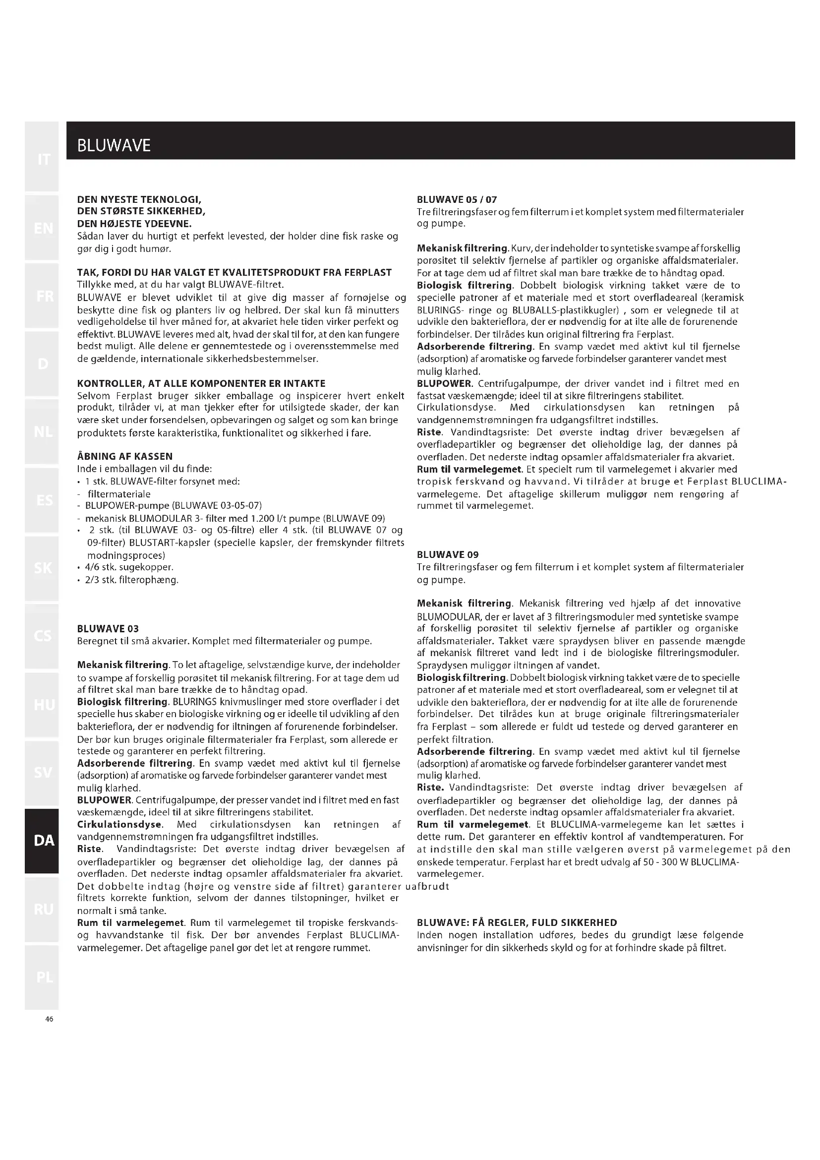DEN NYESTE TEKNOLOGI, DEN STØRSTE SIKKERHED, DEN HØJESTE YDEEVNE. Sådan laver du hurtigt et perfekt levested, der holder dine fisk raske og gør dig i godt humør. TAK, FORDI DU HAR VALGT ET KVALITETSPRODUKT FRA FERPLAST Tillykke med, at du har valgt BLUWAVE-filtret. BLUWAVE er blevet udviklet til at give dig masser af fornøjelse og beskytte dine fisk og planters liv og helbred. Der skal kun få minutters vedligeholdelse til hver måned for, at akvariet hele tiden virker perfekt og effektivt. BLUWAVE leveres med alt, hvad der skal til for, at den kan fungere bedst muligt. Alle delene er gennemtestede og i overensstemmelse med de gældende, internationale sikkerhedsbestemmelser.