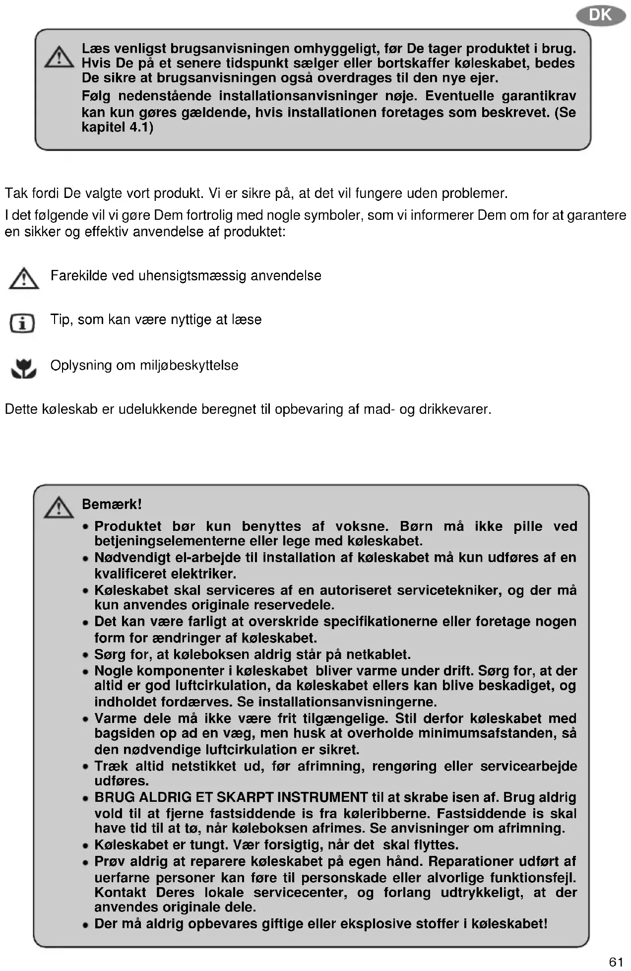 N61 Tak fordi De valgte vort produkt. Vi er sikre på, at det vil fungere uden problemer. I det følgende vil vi gøre Dem fortrolig med nogle symboler, som vi informerer Dem om for at garantere en sikker og effektiv anvendelse af produktet: Farekilde ved uhensigtsmæssig anvendelse Tip, som kan være nyttige at læse Oplysning om miljøbeskyttelse Dette køleskab er udelukkende beregnet til opbevaring af mad- og drikkevarer. Bemærk! Produktet bør kun benyttes af voksne. Børn må ikke pille ved betjeningselementerne eller lege med køleskabet. Nødvendigt el-arbejde til installation af køleskabet må kun udføres af en kvalificeret elektriker. Køleskabet skal serviceres af en autoriseret servicetekniker, og der må kun anvendes originale reservedele. Det kan være farligt at overskride specifikationerne eller foretage nogen form for ændringer af køleskabet. Sørg for, at køleboksen aldrig står på netkablet. Nogle komponenter i køleskabet bliver varme under drift. Sørg for, at der altid er god luftcirkulation, da køleskabet ellers kan blive beskadiget, og indholdet fordærves. Se installationsanvisningerne. Varme dele må ikke være frit tilgængelige. Stil derfor køleskabet med bagsiden op ad en væg, men husk at overholde minimumsafstanden, så den nødvendige luftcirkulation er sikret. Træk altid netstikket ud, før afrimning, rengøring eller servicearbejde udføres. BRUG ALDRIG ET SKARPT INSTRUMENT til at skrabe isen af. Brug aldrig vold til at fjerne fastsiddende is fra køleribberne. Fastsiddende is skal have tid til at tø, når køleboksen afrimes. Se anvisninger om afrimning. Køleskabet er tungt. Vær forsigtig, når det skal flyttes. Prøv aldrig at reparere køleskabet på egen hånd. Reparationer udført af uerfarne personer kan føre til personskade eller alvorlige funktionsfejl. Kontakt Deres lokale servicecenter, og forlang udtrykkeligt, at der anvendes originale dele. Der må aldrig opbevares giftige eller eksplosive stoffer i køleskabet! Læs venligst brugsanvisningen omhyggeligt, før De tager produktet i brug. Hvis De på et senere tidspunkt sælger eller bortskaffer køleskabet, bedes De sikre at brugsanvisningen også overdrages til den nye ejer. Følg nedenstående installationsanvisninger nøje. Eventuelle garantikrav kan kun gøres gældende, hvis installationen foretages som beskrevet. (Se kapitel 4.1) DK62 INDHOLD
