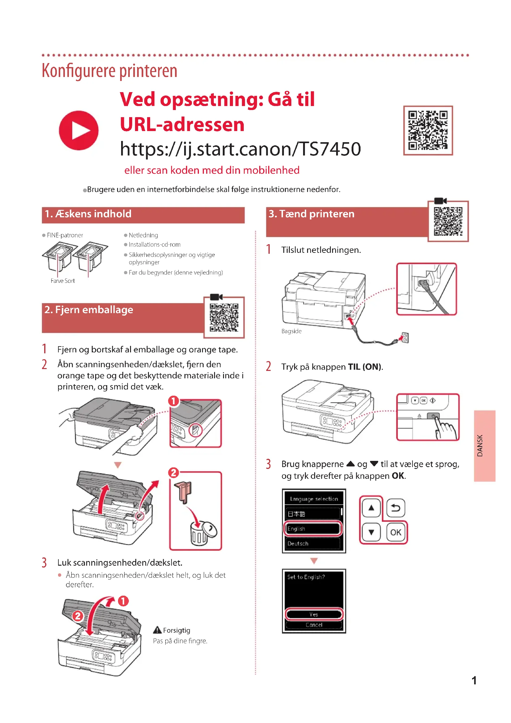 Brug knapperne { og } til at vælge et sprog, og tryk derefter på knappen OK. Ved opsætning: Gå til URL-adressen https://ij.start.canon/TS7450 eller scan koden med din mobilenhed