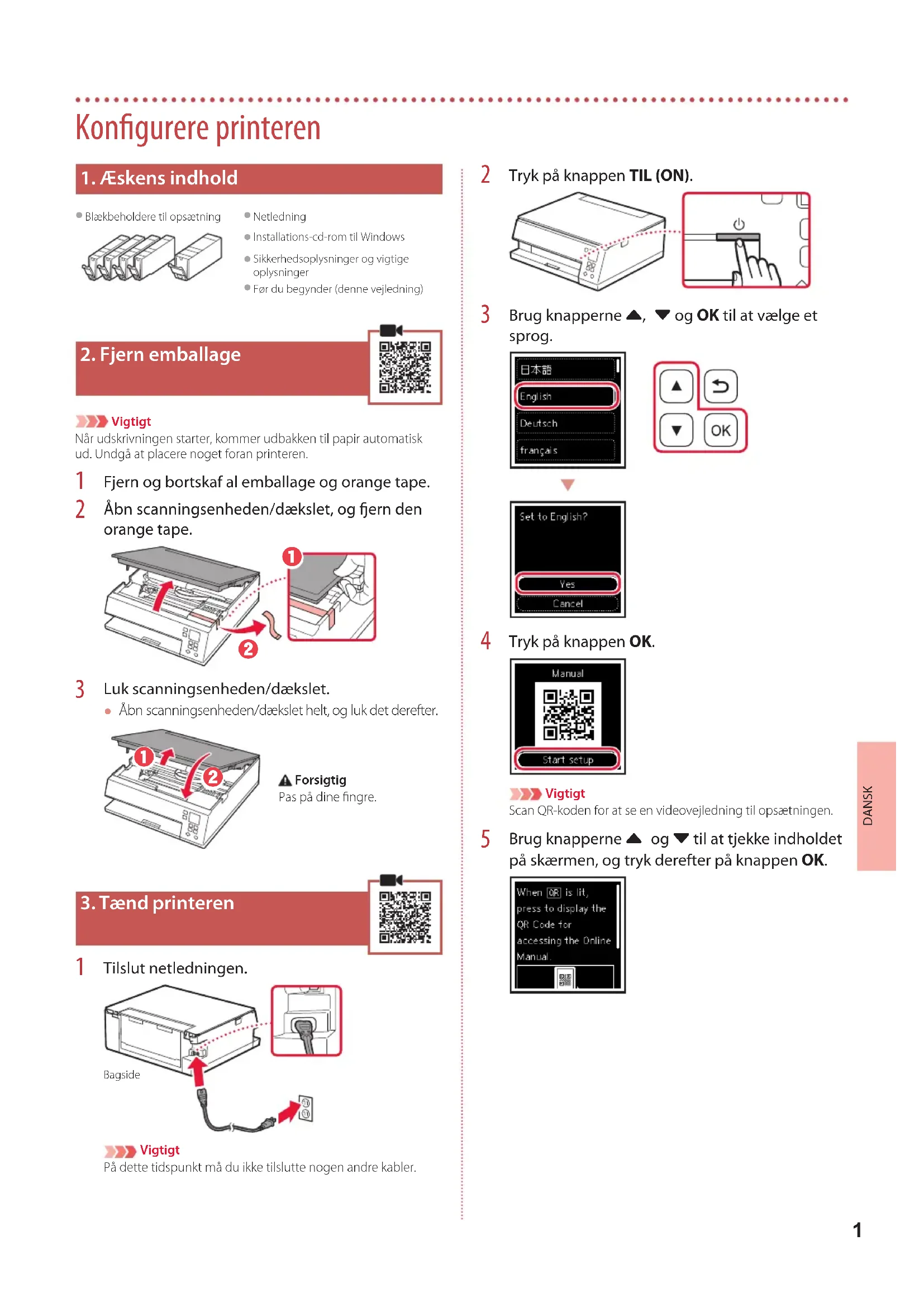 Konfigurere printeren 6-a. Tilslutning til en computer Computer SmartphoneComputer og smartphone Tilslutning til en computer Hvis du bruger flere computere, skal du udføre disse trin på hver computer. Gå til Canon-webstedet fra en computer. Vælg Konfiguration. Skriv printerens modelnavn, og klik på Ok. Klik på Start. Klik på Hvis du allerede har forberedt din, skal du gå til Tilslut. BemærkFølgende trin gælder for Windows- (bortset fra Windows 10 in S mode) og macOS-brugere. Hvis du bruger andre operativsystemer, skal du fortsætte konfigurationen ved at følge instruktionerne på skærmen i stedet. Klik på Hent. Kør den downloadede fil. Klik på Start opsætning (Start Setup). Følg instruktionerne på skærmen. Disse handlinger kan tage lidt tid. Hvis du også vil tilslutte en smartphone, skal du se "6-b. Tilslutning til en smartphone" på side 5.Brug installations-cd-rom'en til Windows Dobbeltklik på EasySetup.exe på cd-rom'en, og fortsæt derefter fra trin 3. Hvis du ikke har internetforbindelse, skal du åbne mappen win på cd-rom'en og dobbeltklikke på SETUP.exe. Herefter installeres printerdriveren. Hvilken enhed tilslutter du?6-b