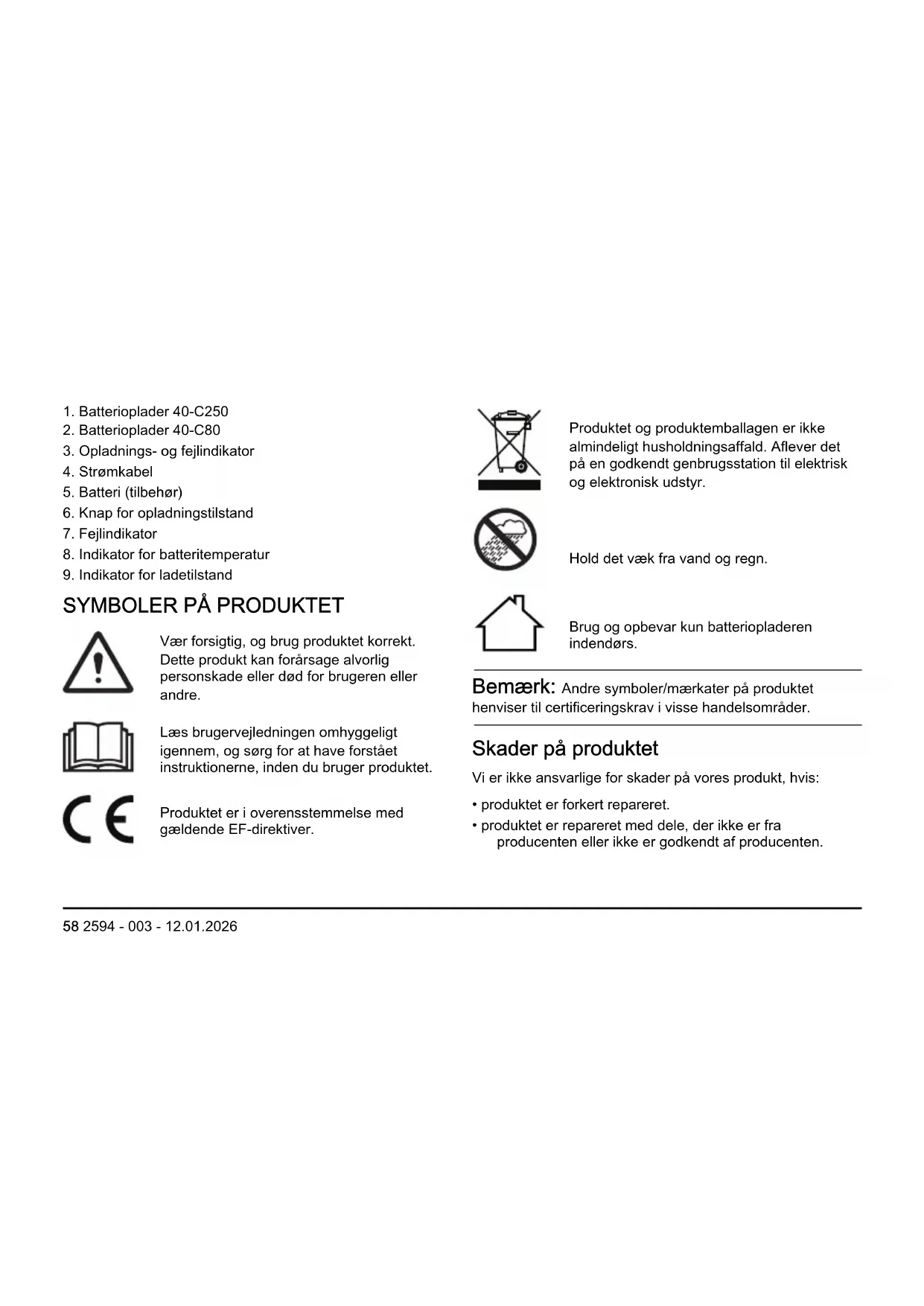 Brug kun batteriopladeren indendørs i et miljø med god luftcirkulation og den korrekte temperatur. 2594 - 003 - 12.01.2026 61• Opbevar batteriopladeren utilgængeligt for børn. Brug ikke batteriopladeren udendørs eller under våde forhold.