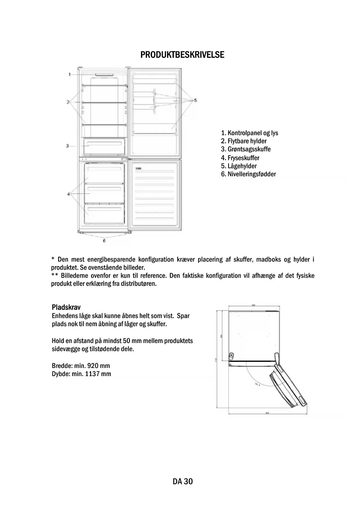 - Den mest energibesparende konfiguration kræver placering af skuffer, madboks og hylder i produktet. Se ovenstående billeder. ** Billederne ovenfor er kun til reference. Den faktiske konfiguration vil afhænge af det fysiske produkt eller erklæring fra distributøren. Pladskrav Enhedens låge skal kunne åbnes helt som vist. Spar plads nok til nem åbning af låger og skuffer. Hold en afstand på mindst 50 mm mellem produktets sidevægge og tilstødende dele. Bredde: min. 920 mm Dybde: min. 1137 mmDA 31 BRUG ➀ TÆND/SLUK-knap, der bruges til at tænde/slukke for apparatet. ➁ Mode-knap, der bruges til at vælge køleskabstemperatur eller særlige funktioner som. ➂ Wi-Fi-ikon, viser, om apparatet er tilsluttet appen. ➃ Super Cool-ikon, viser, om funktionen er aktiveret. ➄ Temperaturniveauer, viser hvilken temperatur der er valgt. Brug