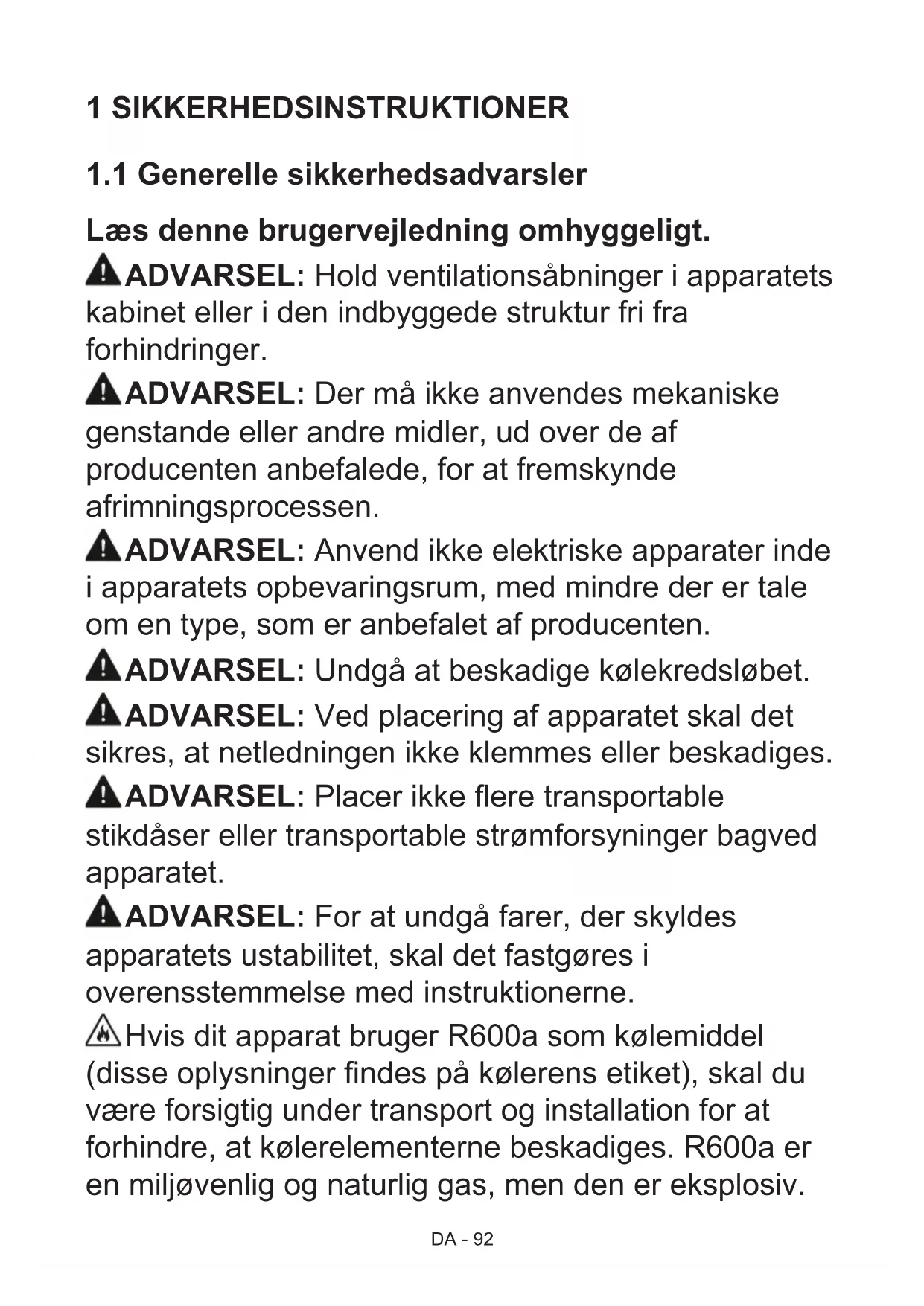 Læs denne brugervejledning omhyggeligt. ADVARSEL: Hold ventilationsåbninger i apparatets kabinet eller i den indbyggede struktur fri fra forhindringer. ADVARSEL: Der må ikke anvendes mekaniske genstande eller andre midler, ud over de af producenten anbefalede, for at fremskynde afrimningsprocessen. ADVARSEL: Anvend ikke elektriske apparater inde i apparatets opbevaringsrum, med mindre der er tale om en type, som er anbefalet af producenten. ADVARSEL: Undgå at beskadige kølekredsløbet. ADVARSEL: Ved placering af apparatet skal det sikres, at netledningen ikke klemmes eller beskadiges. ADVARSEL: Placer ikke ere transportable stikdåser eller transportable strømforsyninger bagved apparatet. ADVARSEL: For at undgå farer, der skyldes apparatets ustabilitet, skal det fastgøres i overensstemmelse med instruktionerne. Hvis dit apparat bruger R600a som kølemiddel (disse oplysninger ndes på kølerens etiket), skal du være forsigtig under transport og installation for at forhindre, at kølerelementerne beskadiges. R600a er en miljøvenlig og naturlig gas, men den er eksplosiv.DA - 93 Ved tilfælde af lækage opstået grundet skader på køleelementerne, ytte køleskabet væk fra åben ild eller varmekilder og ventiler rummet, hvor apparatet er placeret i et par minutter.