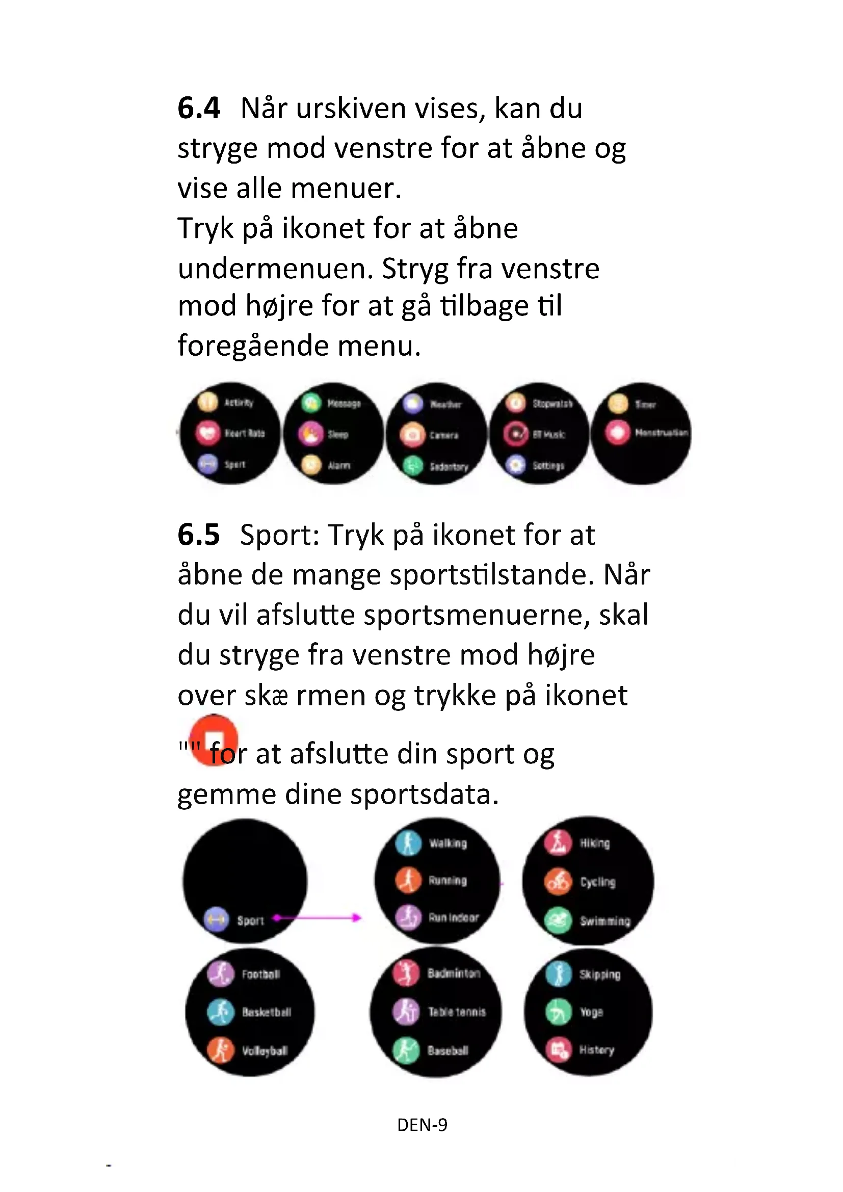 åbne de mange sportstilstande. Når du vil afslutte sportsmenuerne, skal du stryge fra venstre mod højre over skæ rmen og trykke på ikonet " " for at afslutte din sport og gemme dine sportsdata.DEN-10 Der vises en påmindelse, hvis du har opnået det sportsmål, du har sat dig. Små mæ ngder data gemmes ikke.