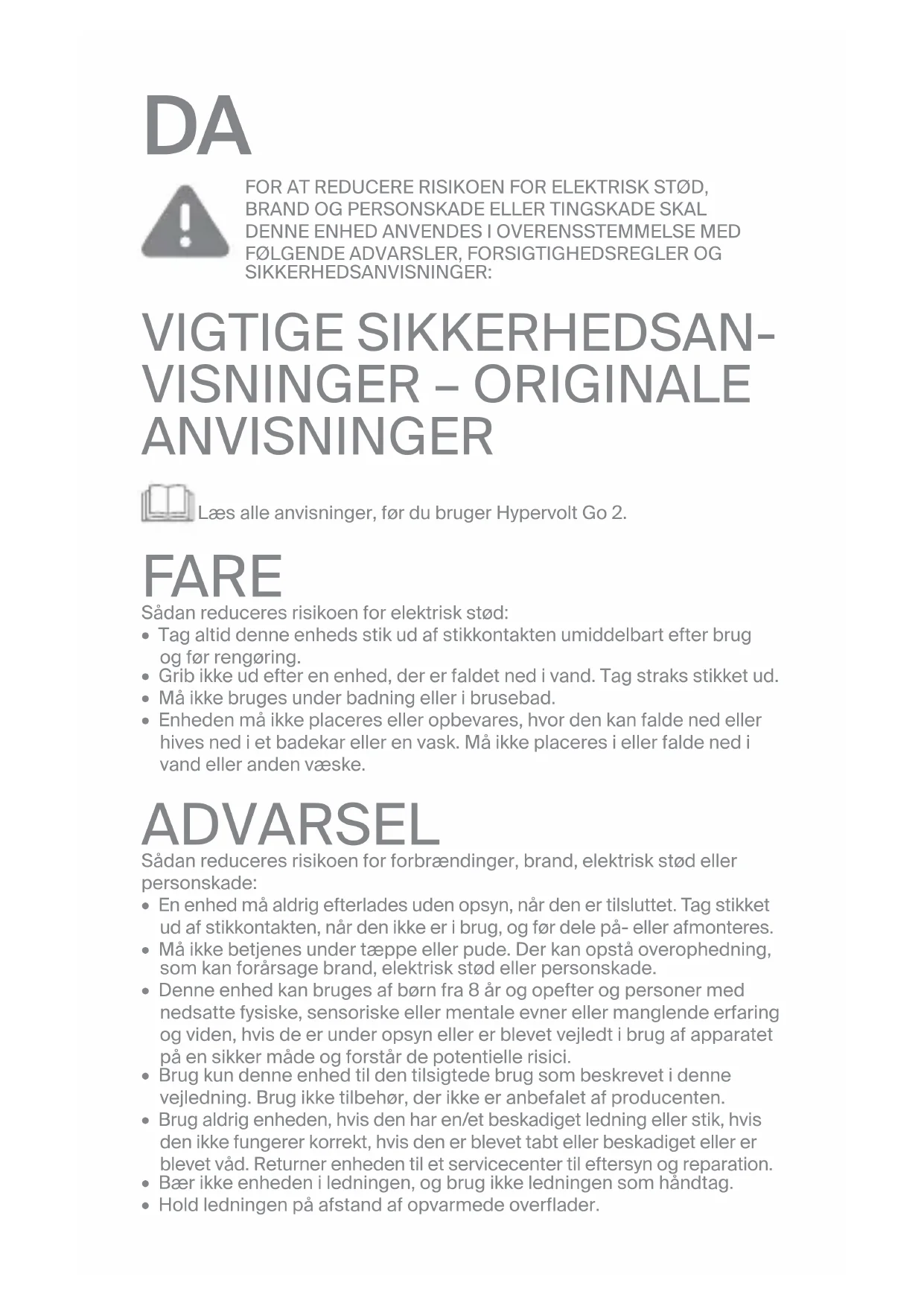 - Hypervolt Go 2 må kun anvendes på tørre, rene overflader på kroppen ved at trykke let på og bevæge den hen over kroppen i ca. tres (60) sekunder pr. område. Hypervolt Go 2 må kun anvendes på områder af kroppen med blødt væv og må ikke anvendes på nogen hårde eller knoglede områder af kroppen, herunder hovedet. Stop straks brugen af Hypervolt Go 2, hvis du oplever smerte eller ubehag, bortset fra let muskelømhed. Du kan opleve at få blå mærker ved brug af Hypervolt Go 2, uanset trykindstillingen, og hvis du får blå mærker, bør du ikke bruge Hypervolt Go 2 på det pågældende område, før det er helet. Du bør også undgå at bruge Hypervolt Go 2 på blå mærker, læsioner, udslæt eller irriterede eller beskadigede områder af huden, indtil de er helet. Når du bruger Hypervolt Go 2, skal du sørge for at holde fingre, tæer, hår og andre kropsdele væk fra bagsiden af hovedtilbehøret for at undgå klemning eller sammenfiltring af håret. Hypervolt Go 2 må kun oplades med den dobbeltisolerede 18 V DC Hyperice-oplader (modelnummer MX24Z2-1801000), der blev leveret sammen med enheden. Lad ikke Hypervolt Go 2 oplade natten over, og efterlad ikke Hypervolt Go 2 uden opsyn under opladning eller brug. Brug ikke Hypervolt Go 2 eller en percussion-enhed uden forudgående godkendelse fra din læge, hvis nogen af følgende tilstande gør sig gældende: