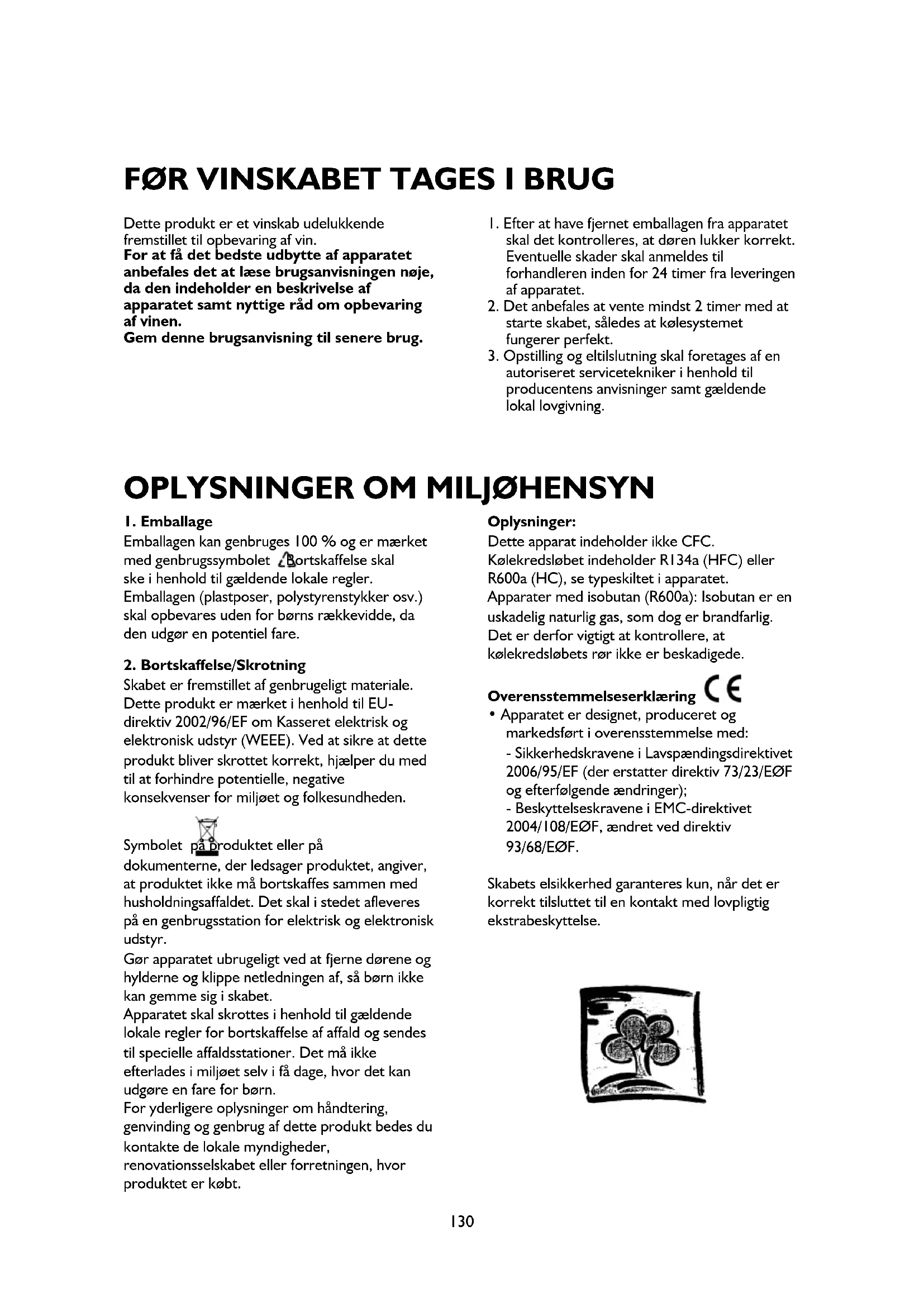 Skabet er fremstillet af genbrugeligt materiale. Dette produkt er mærket i henhold til EU- direktiv 2002/96/EF om Kasseret elektrisk og elektronisk udstyr (WEEE). Ved at sikre at dette produkt bliver skrottet korrekt, hjælper du med til at forhindre potentielle, negative konsekvenser for miljøet og folkesundheden. Symbolet på produktet eller på dokumenterne, der ledsager produktet, angiver, at produktet ikke må bortskaffes sammen med husholdningsaffaldet. Det skal i stedet afleveres på en genbrugsstation for elektrisk og elektronisk udstyr. Gør apparatet ubrugeligt ved at fjerne dørene og hylderne og klippe netledningen af, så børn ikke kan gemme sig i skabet. Apparatet skal skrottes i henhold til gældende lokale regler for bortskaffelse af affald og sendes til specielle affaldsstationer. Det må ikke efterlades i miljøet selv i få dage, hvor det kan udgøre en fare for børn. For yderligere oplysninger om håndtering, genvinding og genbrug af dette produkt bedes du kontakte de lokale myndigheder, renovationsselskabet eller forretningen, hvor produktet er købt. Oplysninger: Dette apparat indeholder ikke CFC. Kølekredsløbet indeholder R134a (HFC) eller R600a (HC), se typeskiltet i apparatet. Apparater med isobutan (R600a): Isobutan er en uskadelig naturlig gas, som dog er brandfarlig. Det er derfor vigtigt at kontrollere, at kølekredsløbets rør ikke er beskadigede. Overensstemmelseserklæring