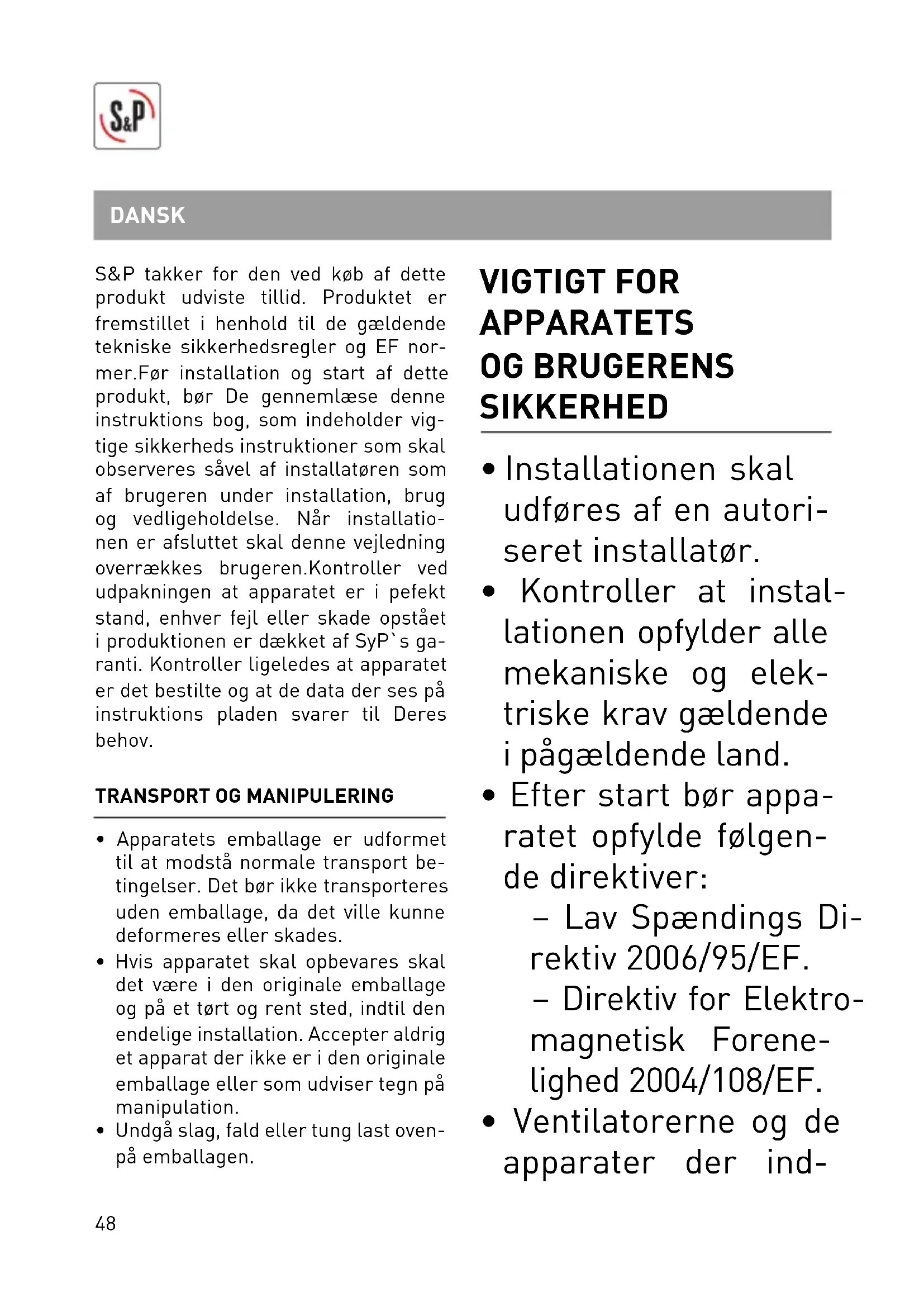 - Hvis apparatet skal opbevares skal det være i den originale emballage og på et tørt og rent sted, indtil den endelige installation. Accepter aldrig et apparat der ikke er i den originale emballage eller som udviser tegn på manipulation.