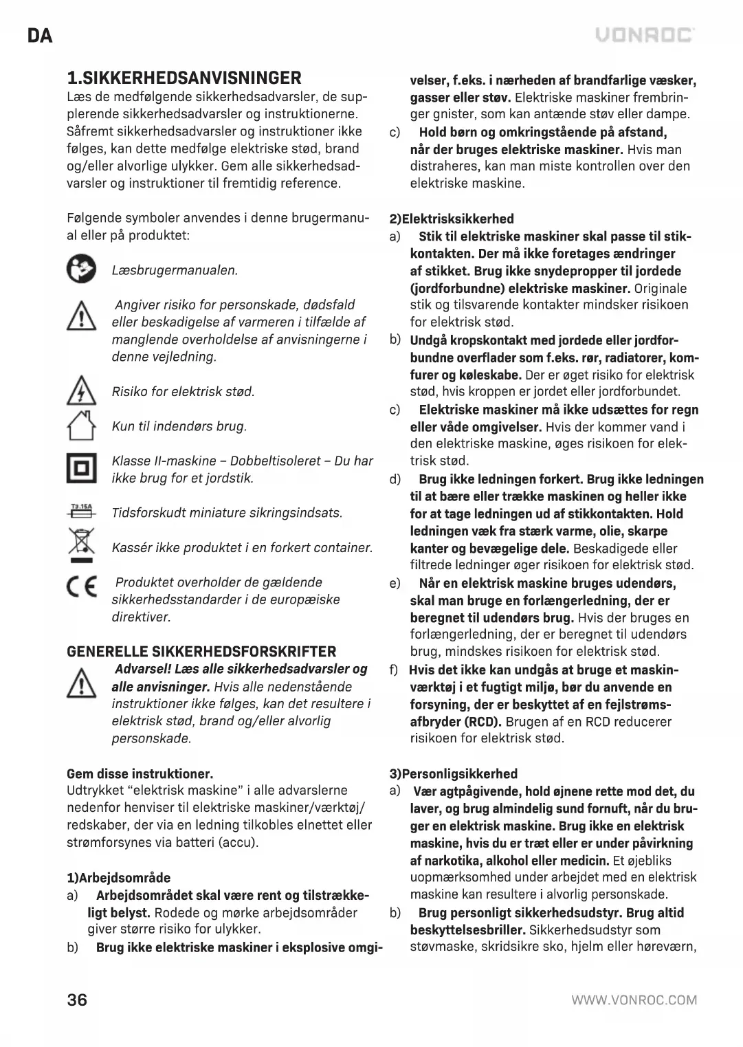 Før rengøring og vedligeholdelse skal du altid slukke for maskinen og trække netstikket ud af kontakten. Rengør maskinbeklædningerne regelmæssigt med en blød klud, helst efter hver anvendelse. Sørg for, at der ikke er støv eller snavs i ventilationsåbnin- gerne. Fjern snavs, der sidder meget godt fast, med en blød klud, der er fugtet i sæbevand. Brug ikke opløsningsmidler, som f.eks. benzin, sprit, ammoniak osv. Kemikalier som disse beskadiger de syntetiske komponenter. MILJØ Defekte og/eller bortskaffede elektriske og elektroniske apparater skal afleveres på en passende genbrugsstation. Kun for lande i EU Maskinværktøj må ikke bortskaffes sammen med husholdningsaffald. Ifølge EU-direktiv 2012/19/EU om affald af elektrisk og elektronisk udstyr og dets gennemførelse i den nationale lovgivning skal mas- kinværktøjer, der ikke længere anvendes, afleveres separat og bortskaffes på en miljøvenlig måde. GARANTIVILKÅR VONROC produkter er udviklet efter de højeste kvalitetsstandarder og er garanteret fri for mangler i såvel materialer som udførelse i den lovpligtige periode, der starter fra datoen for det oprindelige køb. Skulle produktet udvikle nogen fejl i løbet af denne periode på grund af defekte materialer og/ eller fabrikationsfejl, så kontakt VONROC direkte. De følgende forhold er udelukket fra denne garanti: