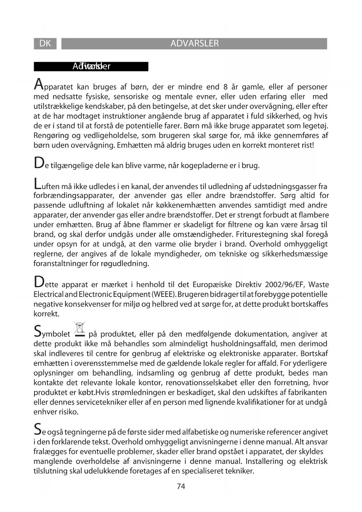 Advarsler ADVARSLER Apparatet kan bruges af børn, der er mindre end 8 år gamle, eller af personer med nedsatte fysiske, sensoriske og mentale evner, eller uden erfaring eller med utilstrækkelige kendskaber, på den betingelse, at det sker under overvågning, eller efter at de har modtaget instruktioner angående brug af apparatet i fuld sikkerhed, og hvis de er i stand til at forstå de potentielle farer. Børn må ikke bruge apparatet som legetøj. Rengøring og vedligeholdelse, som brugeren skal sørge for, må ikke gennemføres af børn uden overvågning. Emhætten må aldrig bruges uden en korrekt monteret rist! De tilgængelige dele kan blive varme, når kogepladerne er i brug. Luften må ikke udledes i en kanal, der anvendes til udledning af udstødningsgasser fra forbrændingsapparater, der anvender gas eller andre brændstoer. Sørg altid for passende udluftning af lokalet når køkkenemhætten anvendes samtidigt med andre apparater, der anvender gas eller andre brændstoer. Det er strengt forbudt at ambere under emhætten. Brug af åbne ammer er skadeligt for ltrene og kan være årsag til brand, og skal derfor undgås under alle omstændigheder. Friturestegning skal foregå under opsyn for at undgå, at den varme olie bryder i brand. Overhold omhyggeligt reglerne, der angives af de lokale myndigheder, om tekniske og sikkerhedsmæssige foranstaltninger for røgudledning. Dette apparat er mærket i henhold til det Europæiske Direktiv 2002/96/EF, Waste Electrical and Electronic Equipment (WEEE). Brugeren bidrager til at forebygge potentielle negative konsekvenser for miljø og helbred ved at sørge for, at dette produkt bortskaes korrekt. Symbolet på produktet, eller på den medfølgende dokumentation, angiver at dette produkt ikke må behandles som almindeligt husholdningsaald, men derimod skal indleveres til centre for genbrug af elektriske og elektroniske apparater. Bortskaf emhætten i overensstemmelse med de gældende lokale regler for aald. For yderligere oplysninger om behandling, indsamling og genbrug af dette produkt, bedes man kontakte det relevante lokale kontor, renovationsselskabet eller den forretning, hvor produktet er købt.Hvis strømledningen er beskadiget, skal den udskiftes af fabrikanten eller dennes servicetekniker eller af en person med lignende kvalikationer for at undgå enhver risiko. Se også tegningerne på de første sider med alfabetiske og numeriske referencer angivet i den forklarende tekst. Overhold omhyggeligt anvisningerne i denne manual. Alt ansvar fralægges for eventuelle problemer, skader eller brand opstået i apparatet, der skyldes manglende overholdelse af anvisningerne i denne manual. Installering og elektrisk tilslutning skal udelukkende foretages af en specialiseret tekniker.AVVERTENZE