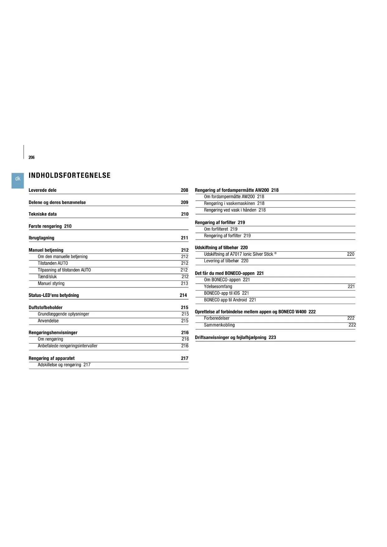 Levering af tilbehør 220 Det får du med BONECO-appen 221 Om BONECO-appen 221 Ydelsesomfang 221 BONECO-app til iOS 221 BONECO app til Android 221 Oprettelse af forbindelse mellem appen og BONECO W400 222 Forberedelser 222 Sammenkobling 222 Driftsanvisninger og fejlafhjælpning 223 Leverede dele 208 Delene og deres benævnelse 209 Tekniske data 210 Første rengøring 210 Ibrugtagning 211 Manuel betjening 212 Om den manuelle betjening 212 Tilstanden AUTO 212 Tilpasning af tilstanden AUTO 212 Tænd/sluk 212 Manuel styring 213 Status-LED’ens betydning 214 Duftstofbeholder 215 Grundlæggende oplysninger 215 Anvendelse 215 Rengøringshenvisninger 216 Om rengøring 216 Anbefalede rengøringsintervaller 216 Rengøring af apparatet 217 Adskillelse og rengøring 217 INDHOLDSFORTEGNELSEBONECO APP Fordele med BONECO app’en med mange nyttige tips om din BONECO luftbefugter. Sikring af hygiejnisk drift og forbedring af luftkvaliteten indendørs. Dine fordele: ■ Funktioner til BONECO Bluetooth-enheder ■ Køb tilbehør og enheder online ■ Produktoplysninger ■ Brugsanvisning ■ Praktisk vedligeholdelseskalender ■ … og meget mere208