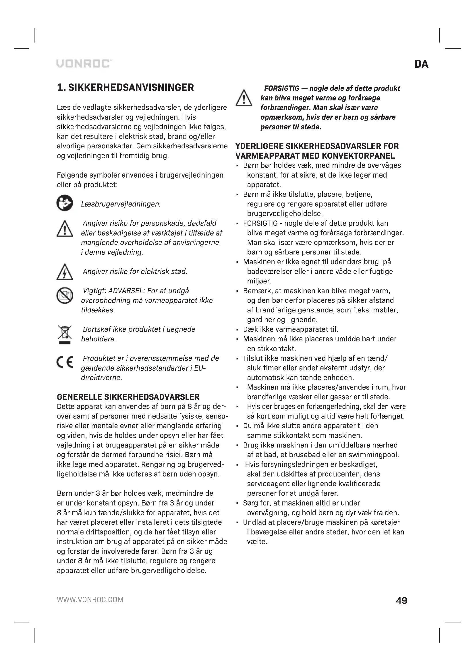 Læs de vedlagte sikkerhedsadvarsler, de yderligere sikkerhedsadvarsler og vejledningen. Hvis sikkerhedsadvarslerne og vejledningen ikke følges, kan det resultere ielektrisk stød, brand og/eller alvorlige personskader. Gem sikkerhedsadvarslerne og vejledningen til fremtidig brug. Følgende symboler anvendes ibrugervejledningen eller på produktet: Læs brugervejledningen. Angiver risiko for personskade, dødsfald eller beskadigelse af værktøjet itilfælde af manglende overholdelse af anvisningerne idenne vejledning. Angiver risiko for elektrisk stød. Vigtigt: ADVARSEL: For at undgå overophedning må varmeapparatet ikke tildækkes. Bortskaf ikke produktet iuegnede beholdere. Produktet er ioverensstemmelse med de gældende sikkerhedsstandarder iEU- direktiverne. GENERELLE SIKKERHEDSADVARSLER Dette apparat kan anvendes af børn på 8 år og der- over samt af personer med nedsatte fysiske, senso- riske eller mentale evner eller manglende erfaring og viden, hvis de holdes under opsyn eller har fået vejledning i at brugeapparatet på en sikker måde og forstår de dermed forbundne risici. Børn må ikke lege med apparatet. Rengøring og brugerved- ligeholdelse må ikke udføres af børn uden opsyn. Børn under 3 år bør holdes væk, medmindre de er under konstant opsyn. Børn fra 3 år og under 8 år må kun tænde/slukke for apparatet, hvis det har været placeret eller installeret i dets tilsigtede normale driftsposition, og de har fået tilsyn eller instruktion om brug af apparatet på en sikker måde og forstår de involverede farer. Børn fra 3 år og under 8 år må ikke tilslutte, regulere og rengøre apparatet eller udføre brugervedligeholdelse. FORSIGTIG — nogle dele af dette produkt kan blive meget varme og forårsage forbrændinger. Man skal især være opmærksom, hvis der er børn og sårbare personer til stede.