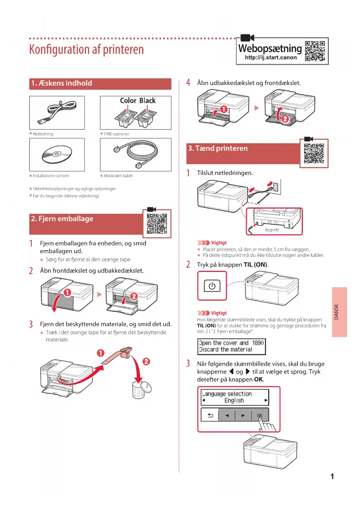 Tilslut netledningen. Bagside Vigtigt Placer printeren, så den er mindst 5 cm fra væggen. På dette tidspunkt må du ikke tilslutte nogen andre kabler. Tryk på knappen TIL (ON). VigtigtHvis følgende skærmbillede vises, skal du trykke på knappen TIL (ON) for at slukke for strømme og gentage proceduren fra trin 2 i "2. Fjern emballage". Når følgende skærmbillede vises, skal du bruge knapperne [ og ] til at vælge et sprog. Tryk derefter på knappen OK. Konguration af printeren Webopsætning2 Konguration af printeren