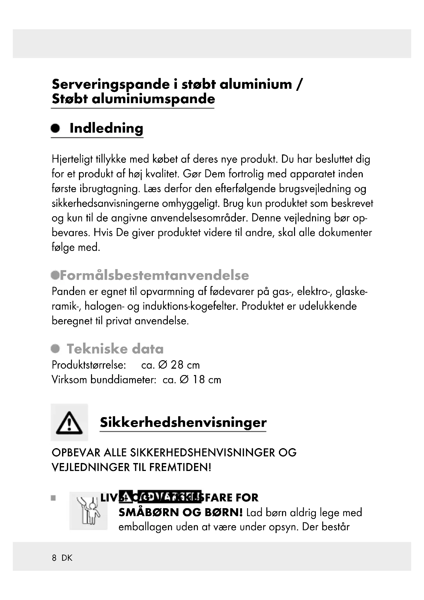 SMÅBØRN OG BØRN! Lad børn aldrig lege med emballagen uden at være under opsyn. Der består9 DK kvælningsfare pga. emballagematerialet. Børn undervurderer hyppigt farerne. Hold altid børn væk fra emballagematerialet. FARE FOR TILSKADEKOMST! Vær opmærksom på at håndtagene kan blive ophedet under kogningen. Derfor tilrådes at bruge grydelapper eller grillhandsker af hensyn til den personlige sikkerhed. Anvend ikke låget når håndtaget er løst. Anvend under ingen omstændigheder, når håndtagene er løse. Spænd i givet fald håndtagenes skruer efter. RISIKO FOR MATERIEL SKADE! Ved madlavning er det meget vigtigt, ikke at lade gryder og pan- der, i hvilke fedt opvarmes, være uden opsyn. Fedt kan hurtigt blive overophedet og antændt. Skulle fedtet engang brænde, så sluk det aldrig med vand. Kvæl flammerne med et pandelåg eller et tykt uldtæppe. Brug udelukkende køkkengrej af varmebestandigt kunststof eller træ, for ikke at beskadige sliplet-coatingen. Skær stegevaren ikke direkt i panden. Læg ikke dryptørt kød i varmt fedt. Gennem det på den glohede kogeplade sprøjtende fedt kan der let opstå brand. Vælg den kogeplade som svarer til pandebundens diameter, for at undgå varmetab. Dette produkts Ø er ca. 18 cm. Artiklen er egnet til at holde madvarer varme i ovnen (maks. 150 °C i 1time). Rens produktet efter brug. Vi anbefaler rengøringen via hånd med varmt vand og opvaskemiddel, fordi rengøringen i opvaskemaskinen kan føre til misfarvninger af aluminiumsdelene. OBS! Glaslåget er skrøbeligt/ikke stødfast!10 DK Ved opvask via hånd skal De rengøre panden med varmt vand og handelsgængs opvaskemiddel. Undgå brug af skarpe eller spidse genstande for ikke at beskadige materialet. De må ikke benytte skarpe skuremidler til rengøring. OBS! FORKRADSNINGSFARE! Undgå frem- og tilbageskub- ningen af kogegrejet på glaskeramik-kogefelter! Inden De starter med kogningen, anbefaler vi at tørre kogefeltets overflade og kogegrejets bund af med en ren, fnugfri klud (f.eks. mikrofiberk- lud). Dermed kan De forebygge mod skrammer. Hold det varme produkt aldrig under rindende koldt vand. Produk- tets underside kunne derigennem beskadiges eller falde af produktet. LEVNEDSMIDDELÆGTE! Smags- og lugteegensk- aber påvirkes ikke gennem dette produkt. Produktet er egnet til opvaskemaskinen. Henvisning til induktionskogefelter Henvisning: Under bestemte omstændigheder kan der opstå en lyd, som kan tilbageføres til varmekildens og grydens/pandens elektromagnetiske egenskaber. Dette er normalt og tyder ikke hen på en defekt hos deres indukti- onskogefelt eller kogegrejet. Gryden/ panden skal anbringes på midten af induktionskogefeltet. OBS! Høj opvarmningshastighed! Kogegrej må ikke overophedes ved foropvarmningen. I tilfælde af en overophedning skal rummet luftes grundigt.11 DK Brug Før gryden tages i brug skal eventuelle etiketter fjernes og gryden skylles godt med varmt vand. Inden første anvendelse koges vand op 2 til 3 gange i produktet, for at fjerne eventuelle produktionsrester fuldstændigt. Gryden fedtes let ind. Tomme eller med stegevare fyldte pander må ikke overophedes, da antiklæbeeffekten ellers aftager, henholdsvis coatingen beska- diges. Opvarm det, som skal tilberedes, ved høj / middelhøj varme og lad det efterfølgende simre færdig på lavt blus. Bortskaffelse Indpakningen består af miljøvenlige materialer, der kan bortskaffes ved de stedlige genbrugscentre. Din kommune oplyser om muligheder for bortskaffelse af det udtjente produkt. Garanti Produktet blev produceret omhyggeligt efter de strengeste kvalitetskrav og kontrolleret grundigt inden levering. Hvis der forekommer mangler ved dette produkt, så har de juridiske rettigheder over for sælgeren af dette produkt. Disse juridiske rettigheder indskrænkes ikke af vores ga- ranti, der beskrives i det følgende.12 DK De får 3 års garanti fra købsdatoen på dette produkt. Garantifristen begynder med købsdatoen. Opbevar den originale kassebon på et sikkert sted. Denne kassebon behøves som dokumentation for købet. Hvis der inden for 3 år fra købsdatoen af for dette produkt opstår en materiale- eller fabrikationsfejl, bliver produktet repareret eller erstattet – efter vores valg – af os uden omkostninger for dem. Garantien bort- falder, hvis produktet bliver beskadiget eller ikke anvendes eller vedli- geholdes korrekt. Garantien gælder for materiale- eller fabrikationsfejl. Denne garanti dækker ikke produktdele, som er udsat for normalt slid og derfor kan betragtes som normale sliddele (f.eks. batterier) eller ved skader på skrøbelige dele; f.eks. kontakter, akkumulatorer som er fremstillet af glas.13 FR/BE Sauteuse en fonte d’aluminium / Poêle en fonte d‘aluminium Introduction Nous vous félicitons pour l‘achat de votre nouveau produit. Vous avez opté pour un produit de grande qualité. Avant la première mise en ser- vice, vous devez vous familiariser avec toutes les fonctions du produit. Veuillez lire attentivement le mode d’emploi ci-dessous et les consignes de sécurité. N’utilisez le produit que pour l’usage décrit et les domaines d’application cités. Conservez ces instructions. Si vous donnez le produit à des tiers, remettez-leur également la totalité des documents. Utilisation conforme Cette poêle est conçue pour faire chauffer des aliments sur des plaques de cuisson à gaz, électriques, vitrocéramiques, halogènes et à induction. Ce produit est destiné uniquement à un usage privé. Caractéristiques techniques Taille du produit : env. Ø 28 cm Diamètre effectif du fond : env. Ø 18 cm Consignes de sécurité CONSERVEZ TOUTES LES CONSIGNES DE SÉCURITÉ ET L‘EN- SEMBLE DES INSTRUCTIONS POUR CONSULTATION ULTÉRIEURE !