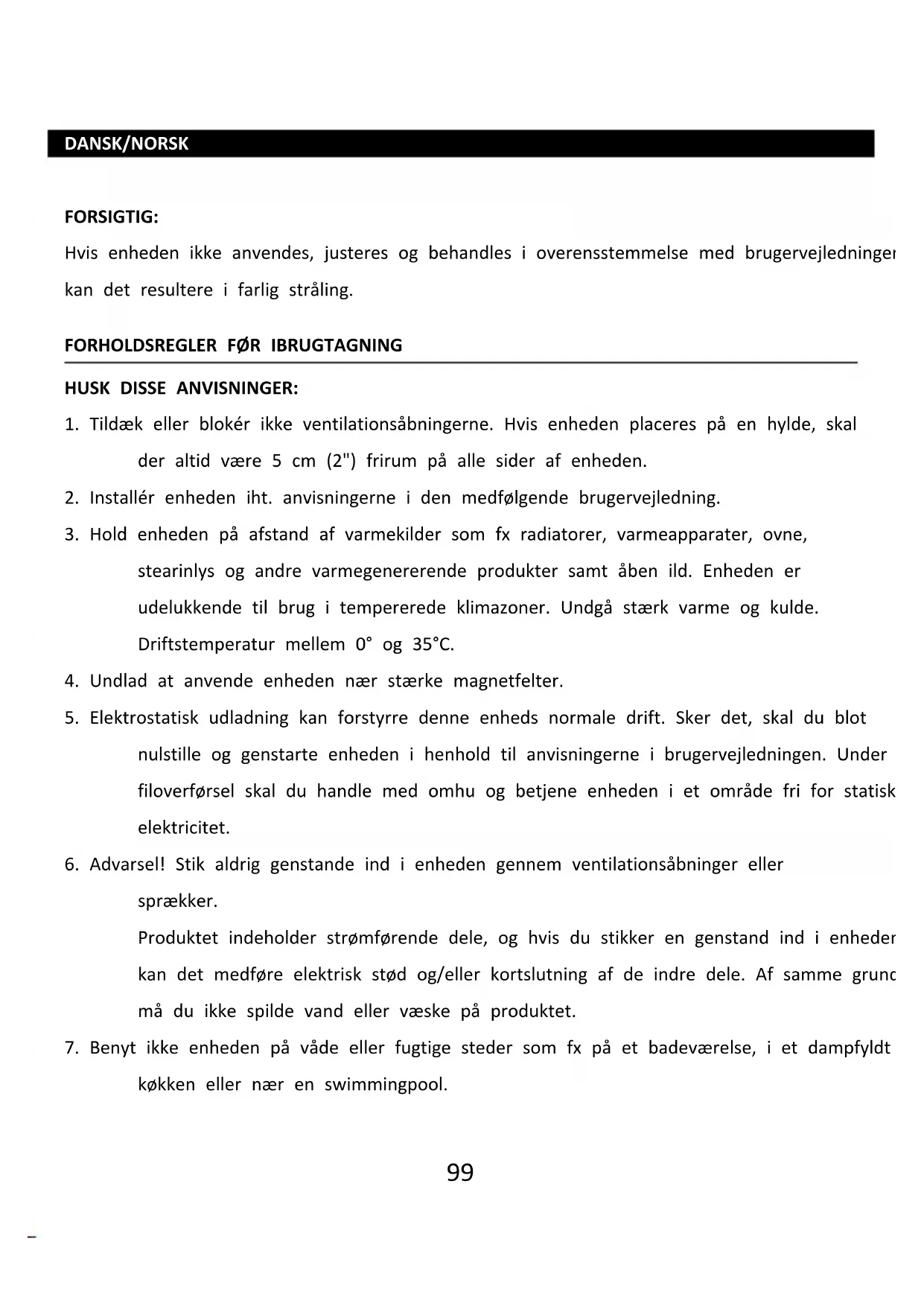 stearinlys og andre varmegenererende produkter samt åben ild. Enheden er udelukkende til brug i tempererede klimazoner. Undgå stærk varme og kulde. Driftstemperatur mellem 0° og 35°C.