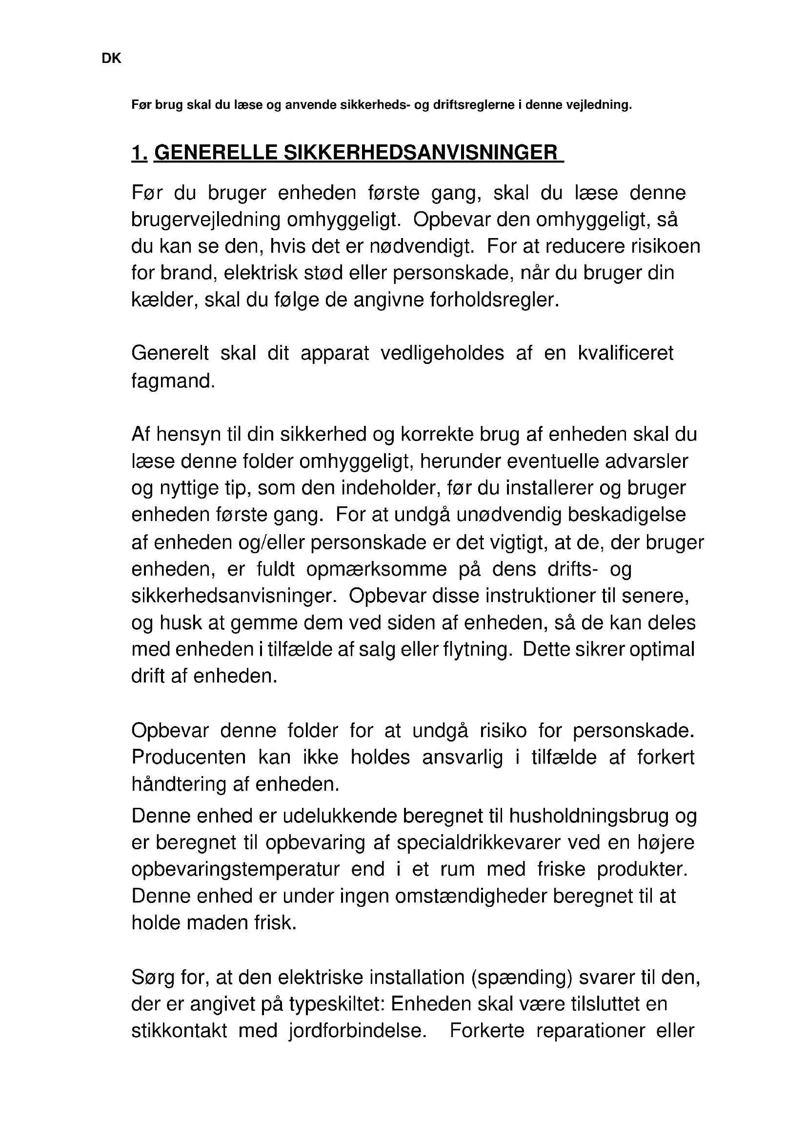 GENERELLE SIKKERHEDSANVISNINGER Før du bruger enheden første gang, skal du læse denne brugervejledning omhyggeligt. Opbevar den omhyggeligt, så du kan se den, hvis det er nødvendigt. For at reducere risikoen for brand, elektrisk stød eller personskade, når du bruger din kælder, skal du følge de angivne forholdsregler. Generelt skal dit apparat vedligeholdes af en kvalificeret fagmand. Af hensyn til din sikkerhed og korrekte brug af enheden skal du læse denne folder omhyggeligt, herunder eventuelle advarsler og nyttige tip, som den indeholder, før du installerer og bruger enheden første gang. For at undgå unødvendig beskadigelse af enheden og/eller personskade er det vigtigt, at de, der bruger enheden, er fuldt opmærksomme på dens drifts- og sikkerhedsanvisninger. Opbevar disse instruktioner til senere, og husk at gemme dem ved siden af enheden, så de kan deles med enheden i tilfælde af salg eller flytning. Dette sikrer optimal drift af enheden. Opbevar denne folder for at undgå risiko for personskade. Producenten kan ikke holdes ansvarlig i tilfælde af forkert håndtering af enheden. Denne enhed er udelukkende beregnet til husholdningsbrug og er beregnet til opbevaring af specialdrikkevarer ved en højere opbevaringstemperatur end i et rum med friske produkter. Denne enhed er under ingen omstændigheder beregnet til at holde maden frisk. Sørg for, at den elektriske installation (spænding) svarer til den, der er angivet på typeskiltet: Enheden skal være tilsluttet en stikkontakt med jordforbindelse. Forkerte reparationer ellerDK tilslutninger kan medføre sikkerhedsrisici. Få din elektriske installation kontrolleret af en professionel, hvis du er i tvivl. Af hensyn til din sikkerhed skal denne enhed være korrekt tilsluttet til en stikkontakt med jordforbindelse. Du må ikke skære i eller fjerne jordledningen fra det medfølgende strømkabel. Af sikkerhedsmæssige årsager må du ikke bruge en forlængerledning. Hvis din enhed er beskadiget (f.eks. ved større stød), eller hvis den beskadiges (overspænding som følge af lynnedslag, oversvømmelse, brand), kan det være farligt at bruge den. Tag stikket ud af stikkontakten, og få apparatet efterset af et autoriseret professionelt værksted. For at undgå fare må du ikke selv udskifte et beskadiget strømkabel. Kontakt din forhandler, et autoriseret servicecenter eller et professionelt værksted. Enheden skal placeres, så der er adgang til stikkontakten. Flyt ikke enheden, når den er fuld: Du kan deformere dens krop og forårsage reparationer. Der må ikke være direkte adgang til elektriske komponenter.