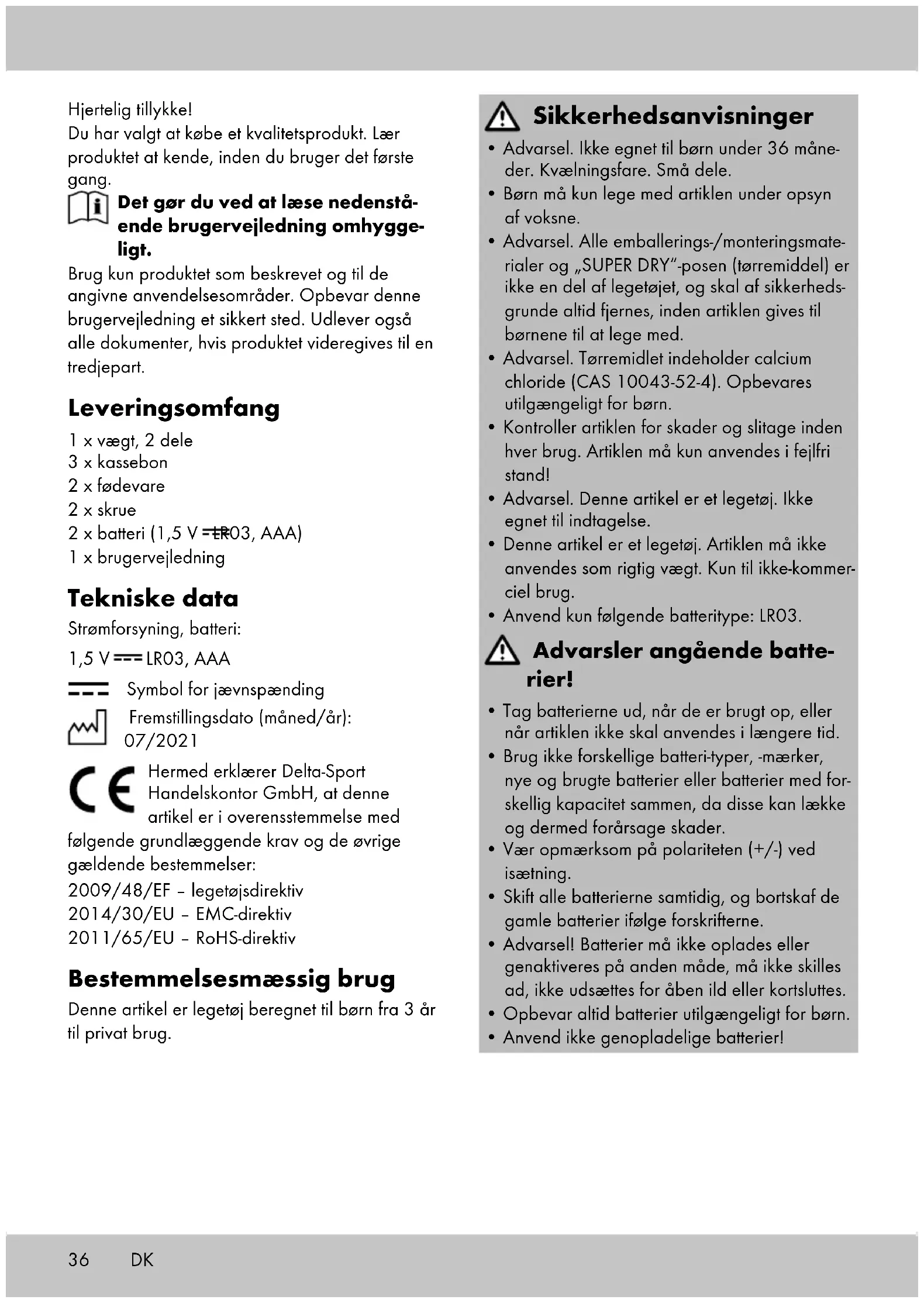 ningselementet for at frigøre en kassebon. Opbevaring, rengøring Opbevar altid artiklen tør, ren, uden batterier og ved stuetemperatur, når den ikke er i brug. Tør den kun af med en tør rengøringsklud. VIGTIGT! Må aldrig rengøres med skrappe rengøringsmidler.38 Henvisninger vedr. bortskaffelse Med henblik på at beskytte miljøet bedst muligt, er det vigtigt, at du ikke smider dit produkt ud sammen med husholdningsaf- faldet, når det ikke længere kan anvendes, men i stedet sørger for at bortskaffe det på en forsvarlig måde. For at få oplysninger om genbrugsstationer og deres åbningstider, bedes du kontakte deres ansvarlige administrati- on. Defekte eller brugte batterier, genopladelige eller ej, skal genbruges i overensstemmelse med direktiv 2006/66/EF samt alle ændringer heraf. Du skal indlevere batterierne, genopladelige eller ej, og/eller produktet hos de genbrugsstati- oner, der findes i dit lokalområde. Emballagema- terialer som f.eks. plasticposer er ikke beregnede til børn. Opbevar emballagematerialet utilgæn- geligt for børn. Miljøskader på grund af ukorrekt bortskaffelse af batterierne, genopladeli- ge eller ej! Batterier, genopladelige eller ej, må ikke bortskaffes sammen med husholdningsaffaldet. De kan indeholde giftige tungmetaller, og er derfor underlagt den samme håndtering som farligt affald. Tungmetallernes kemiske symboler er som følger: Cd = cadmium, Hg = kviksølv, Pb = bly. Indlever derfor de brugte batterier, genopladelige eller ej, på en af de kommunale genbrugsstationer. Bortskaf produktet og emballagemateria- lerne miljørigtigt. Vær opmærksom på emballagemateria- lernes mærkning under affaldssorterin- gen. Disse er markeret med forkortelser (a) og tal (b), der har følgende betydning: 1-7: Kunststoffer/20-22: Papir og pap/80-98: Kompositmaterialer. Produktet og emballagematerialerne kan gen- bruges, hvorfor du bedes bortskaffe dem separat for at opnå en bedre affaldshåndtering. Triman-logoet er kun gældende for Frankrig. De forskellige bortskaffelsesmuligheder, der eksiste- rer for det udtjente produkt, kan du få mere infor- mation om hos kommune- eller byforvaltningen. Oplysninger om garanti og servicehåndtering Varen er fremstillet med største omhu og under løbende kontrol. DELTA-SPORT HANDELS- KONTOR GmbH yder private slutkunder tre års garanti på varen fra købsdato (Garantifrist) i henhold til følgende bestemmelser. Garantien gælder kun for materiale- og fremstillingsfejl. Garantien omfatter ikke dele, der er udsat for normal slid og derfor skal betragtes som sliddele (f.eks. batterier) og ikke skrøbelige dele, f.eks. kontakter, genopladelige batterier eller dele, der er fremstillet af glas. Garantien kan ikke gøres gældende, hvis varen er blevet anvendt ukorrekt eller uagtsomt eller til andre formål end det tilsigtede eller i det tilsigtede omfang. Garantien bortfalder ligeledes ved manglende overholdelse af anvisningerne i betjeningsvejledningen. Kunden skal kunne påvise, at der er tale om materiale- eller fremstil- lingsfejl og ikke fejl som følge af ovenstående omstændigheder. Garantien kan kun gøres gældende i garanti- perioden mod fremvisning af original kvittering. Gem derfor den originale kvittering Garantipe- rioden forlænges ikke i tilfælde af reparation i henhold til garantien, den lovpligtige garanti eller pr. kulance. Dette gælder også for udskifte- de og reparerede dele. I tilfælde af klager er det muligt at kontakte nedenstående servicelinje eller kontakte os pr. e-mail. Ved garantisager vil vi efter eget skøn reparere varen uden beregning, ombytte varen eller refundere købsprisen. Der er ingen yderli- gere rettigheder under garantien. Dine lovmæssige rettigheder, herunder navnlig garantikrav over for sælger, indskrænkes ikke som følge af denne garanti. DK39DK IAN: 366888_2101 Service Danmark Tel.: 32 710005 E-Mail: deltasport@lidl.dk07.05.2021 / PM 12:12 IAN 366888_2101