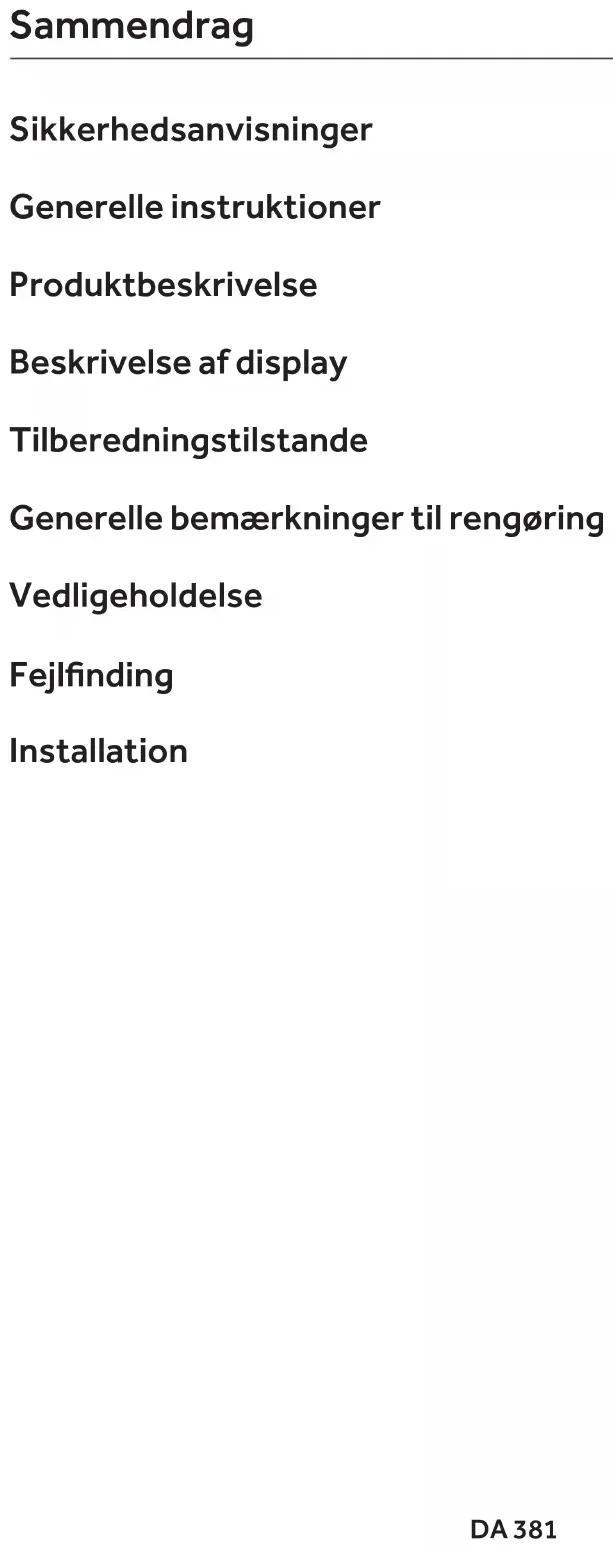 BDA 381 Sikkerhedsanvisninger Generelle instruktioner Produktbeskrivelse Beskrivelse af display Tilberedningstilstande Generelle bemærkninger til rengøring Vedligeholdelse Fejlnding Installation SammendragDA 382