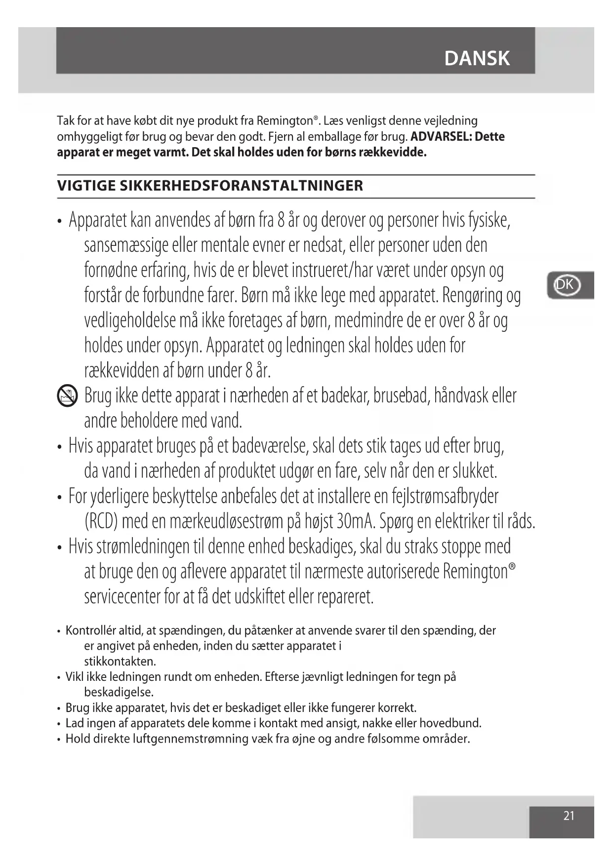 - Hvis strømledningen til denne enhed beskadiges, skal du straks stoppe med at bruge den og aflevere apparatet til nærmeste autoriserede Remington® servicecenter for at få det udskiftet eller repareret.