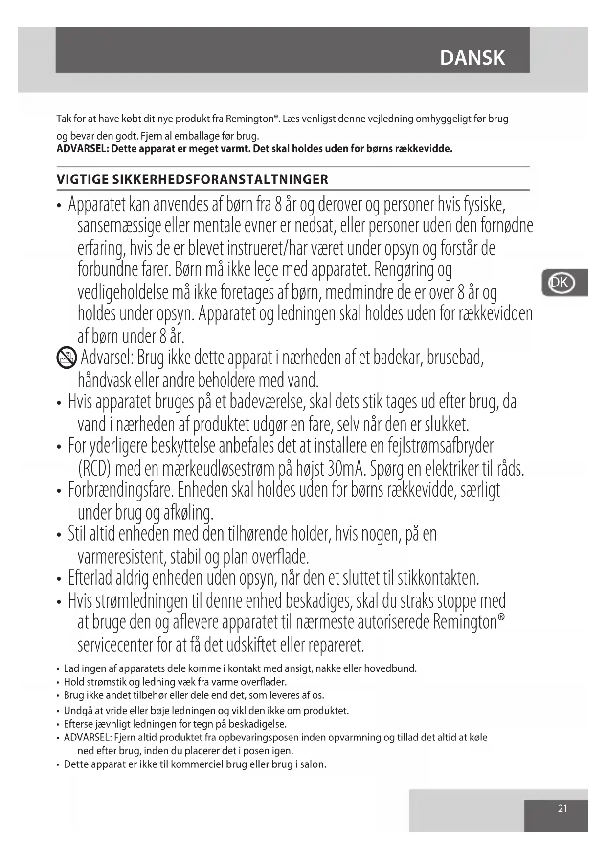 - Hvis strømledningen til davon enchod beskadiges, skal du straks stoppe med at bruge den og aflevere apparatet til nærmestre autoriserede Remington® servicecenter for at få det udskiftet eller repareret.