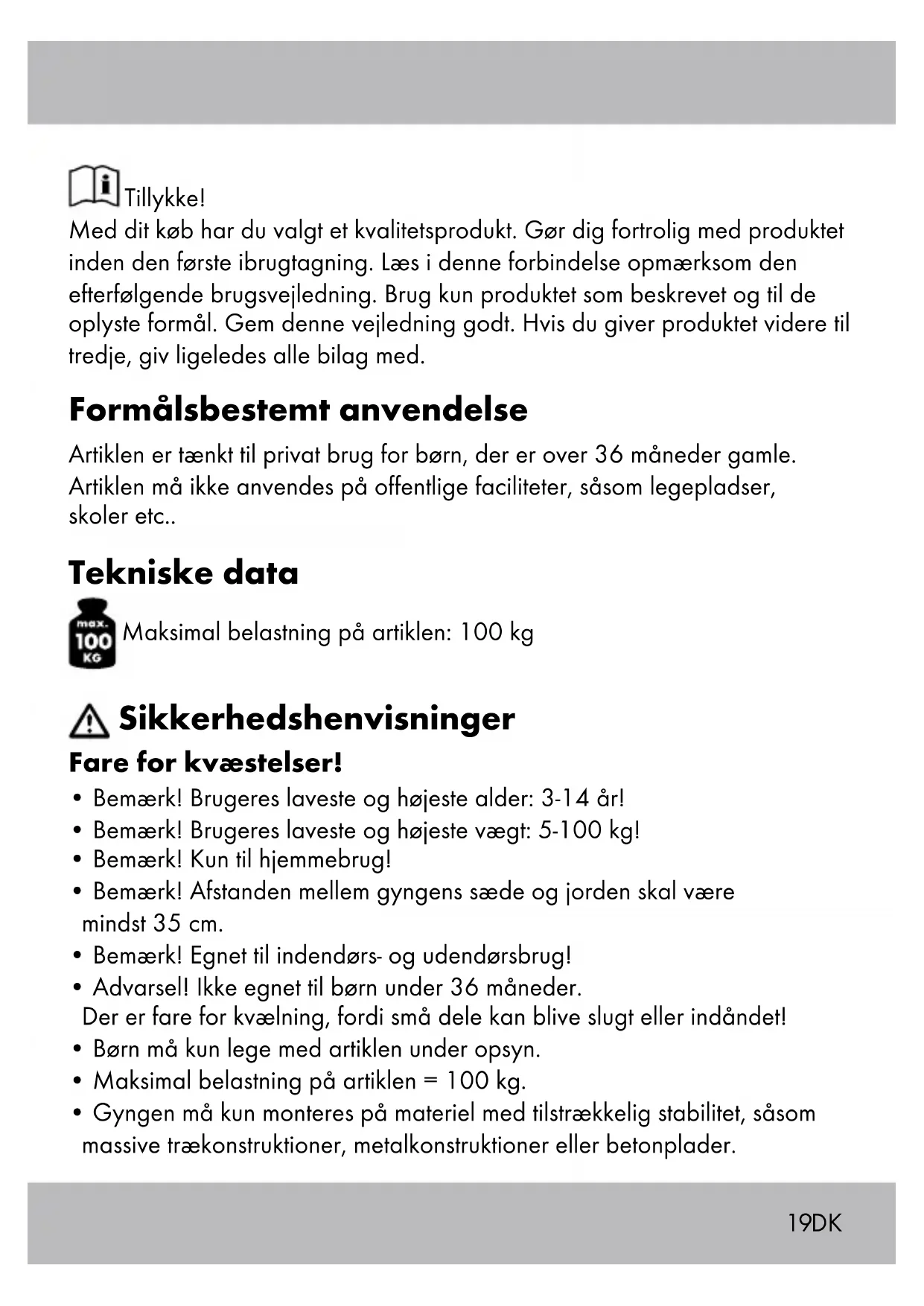 - Gyngen må kun monteres på materiel med tilstrækkelig stabilitet, såsom massive trækonstruktioner, metalkonstruktioner eller betonplader.20 DK