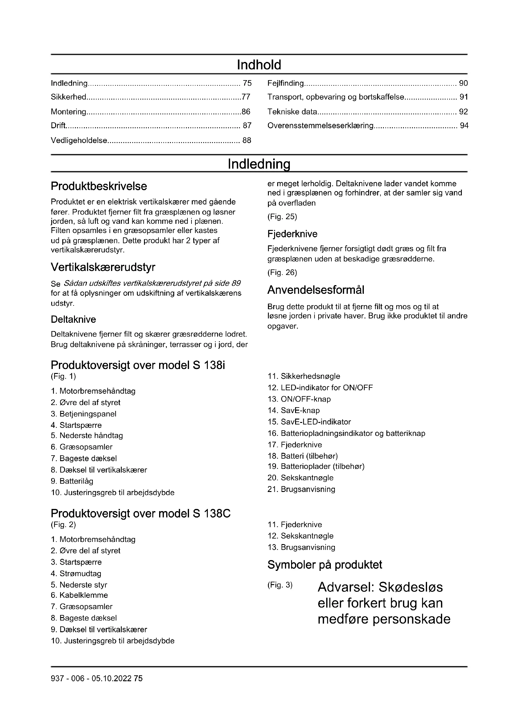 eller andre. (Fig. 4) Læs brugervejledningen, og sørg for at have forstået indholdet, inden du bruger dette produkt. (Fig. 5) Pas på udslyngede genstande og rikochettering. (Fig. 6) Hold uvedkommende personer og dyr på sikker afstand af arbejdsstedet. (Fig. 7) Advarsel: Hold hænder og fødder på sikker afstand af den roterende kniv. (Fig. 8) Tag sikkerhedsnøglen ud, før der foretages vedligeholdelse af produktet (model S 138i). (Fig. 9) Afbryd produktet fra stikkontakten, før du udfører vedligeholdelse på produktet (model S 138C). (Fig. 10) Fare for elektrisk stød (model S 138C). (Fig. 11) Må ikke udsættes for regn (model S 138i). (Fig. 12) Advarsel: Kør ikke produktet hen over strømkablet, da dette kan medføre elektrisk stød eller beskadigelse af produktet (model S 138C). (Fig. 13) Dette produkt er beskyttet mod vandstænk. (Fig. 14) Dette produkt er i overensstemmelse med gældende EAC- direktiver. (Fig. 15) Dette produkt er i overensstemmelse med gældende EF-direktiver. (Fig. 16) Dette produkt er i overensstemmelse med gældende UK- bestemmelser. (Fig. 17) Produktet er i overensstemmelse med de gældende UkrSEPRO-direktiver. (Fig. 18) Mærkat vedrørende emission af støj til omgivelserne i henhold til direktiver og regulativer i 76 937 - 006 - 05.10.2022EU og Storbritannien og New South Wales' lovgivning om "Beskyttelse af miljøet (støjbegrænsning) forordning 2017". Produktets garanterede lydeffektniveau er angivet i Tekniske data på side 92 og på mærkaten. (Fig. 19) Dobbelt isolering (model S 138C). (Fig. 23) Aflever produk- tet på en gen- brugsstation for elektrisk og elektronisk ud- styr. (Gælder kun Europa) (Fig. 24) Startprocedure for model S 138i: Tryk på ON/OFF-knap- pen, løsn start- spærren, tryk motorbremse- håndtaget ned. (Fig. 20) Startprocedure for model S 138C: Løsn startspærren, tryk motorbremsehåndtaget ned. (Fig. 21) Slip motorbremsehåndtaget for at stoppe. (Fig. 22) Kode, der kan scannes. Bemærk: Andre symboler/mærkater på produktet henviser til certificeringskrav på visse markeder. Produktansvar Som nævnt i produktansvarsbestemmelserne hæfter vi ikke for skader forårsaget af vores produkt, hvis: