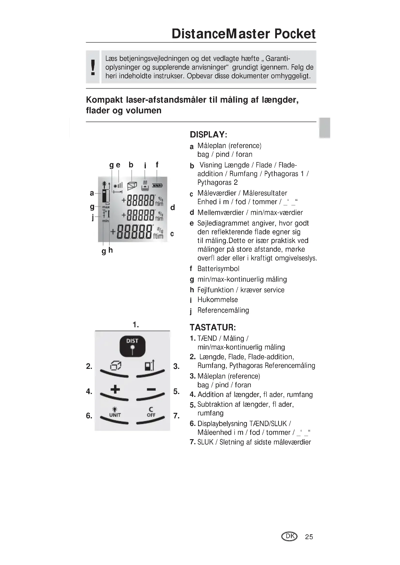 Kompakt laser-afstandsmåler til måling af længder, flader og volumen 1.3Karte_Manual_DistanceMaster-Pocket_Rev.0612.indd 25 02.08.12 10:25DK
