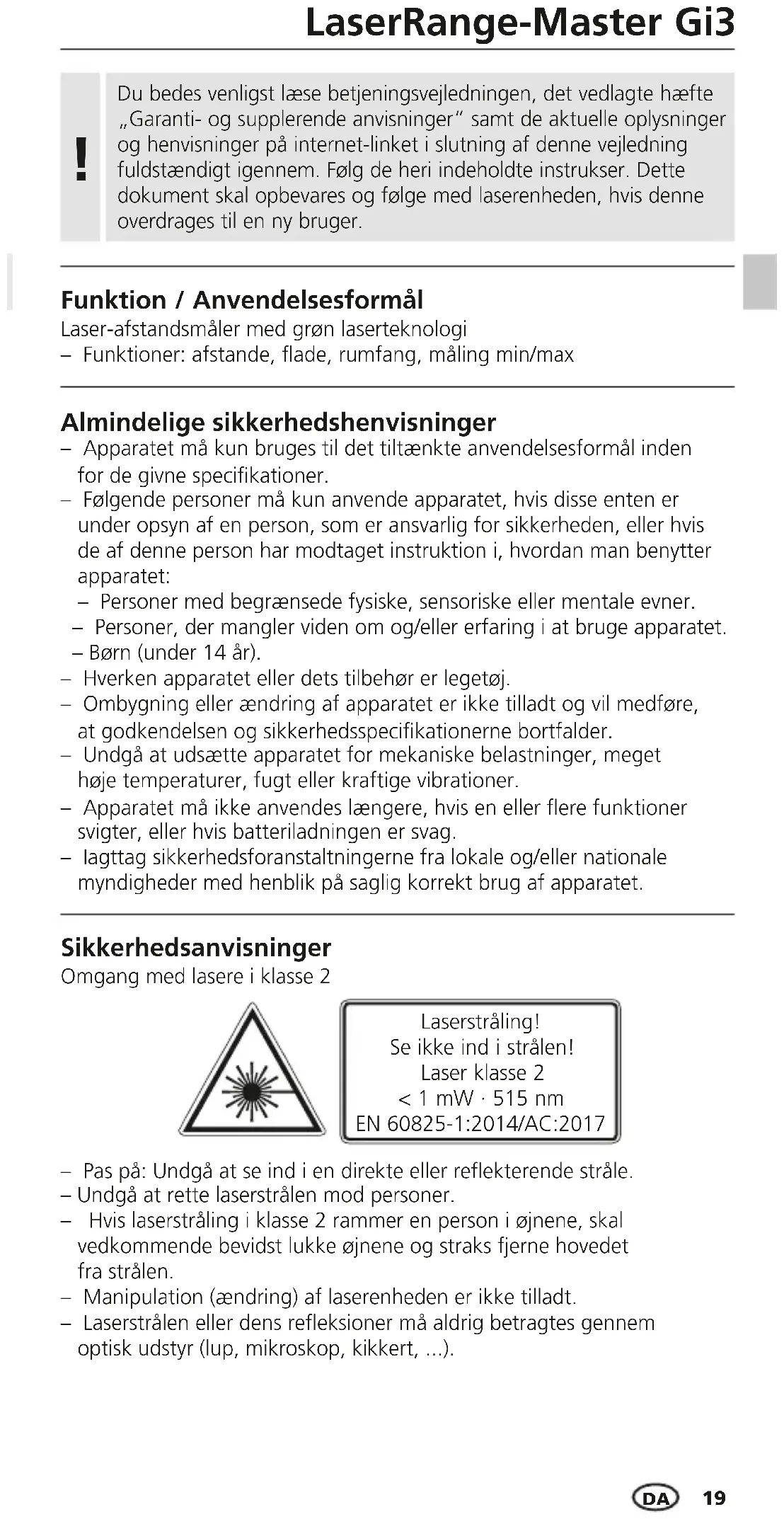 Funktion / Anvendelsesformål Du bedes venligst læse betjeningsvejledningen, det vedlagte hæfte „Garanti- og supplerende anvisninger“ samt de aktuelle oplysninger og henvisninger på internet-linket i slutning af denne vejledning fuldstændigt igennem. Følg de heri indeholdte instrukser. Dette dokument skal opbevares og følge med laserenheden, hvis denne overdrages til en ny bruger.