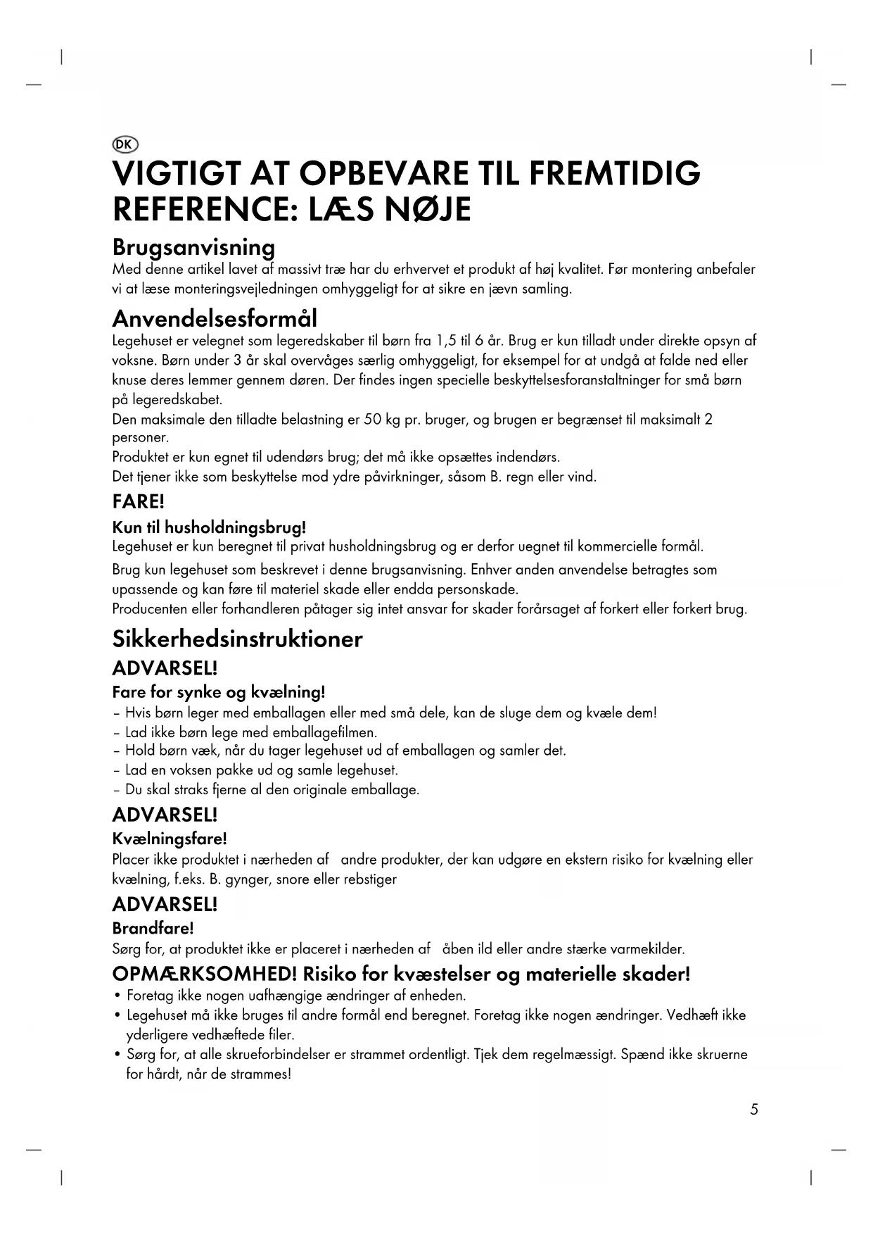Brugsanvisning Med denne artikel lavet af massivt træ har du erhvervet et produkt af høj kvalitet. Før montering anbefaler vi at læse monteringsvejledningen omhyggeligt for at sikre en jævn samling. Anvendelsesformål Legehuset er velegnet som legeredskaber til børn fra 1,5 til 6 år. Brug er kun tilladt under direkte opsyn af voksne. Børn under 3 år skal overvåges særlig omhyggeligt, for eksempel for at undgå at falde ned eller knuse deres lemmer gennem døren. Der findes ingen specielle beskyttelsesforanstaltninger for små børn på legeredskabet. Den maksimale den tilladte belastning er 50 kg pr. bruger, og brugen er begrænset til maksimalt 2 personer. Produktet er kun egnet til udendørs brug; det må ikke opsættes indendørs. Det tjener ikke som beskyttelse mod ydre påvirkninger, såsom B. regn eller vind. FARE! Kun til husholdningsbrug! Legehuset er kun beregnet til privat husholdningsbrug og er derfor uegnet til kommercielle formål. Brug kun legehuset som beskrevet i denne brugsanvisning. Enhver anden anvendelse betragtes som upassende og kan føre til materiel skade eller endda personskade. Producenten eller forhandleren påtager sig intet ansvar for skader forårsaget af forkert eller forkert brug. Sikkerhedsinstruktioner ADVARSEL! Fare for synke og kvælning! – Hvis børn leger med emballagen eller med små dele, kan de sluge dem og kvæle dem! – Lad ikke børn lege med emballagefilmen. – Hold børn væk, når du tager legehuset ud af emballagen og samler det. – Lad en voksen pakke ud og samle legehuset. – Du skal straks fjerne al den originale emballage. ADVARSEL! Kvælningsfare! Placer ikke produktet i nærheden af andre produkter, der kan udgøre en ekstern risiko for kvælning eller kvælning, f.eks. B. gynger, snore eller rebstiger ADVARSEL! Brandfare! Sørg for, at produktet ikke er placeret i nærheden af åben ild eller andre stærke varmekilder. OPMÆRKSOMHED! Risiko for kvæstelser og materielle skader!
