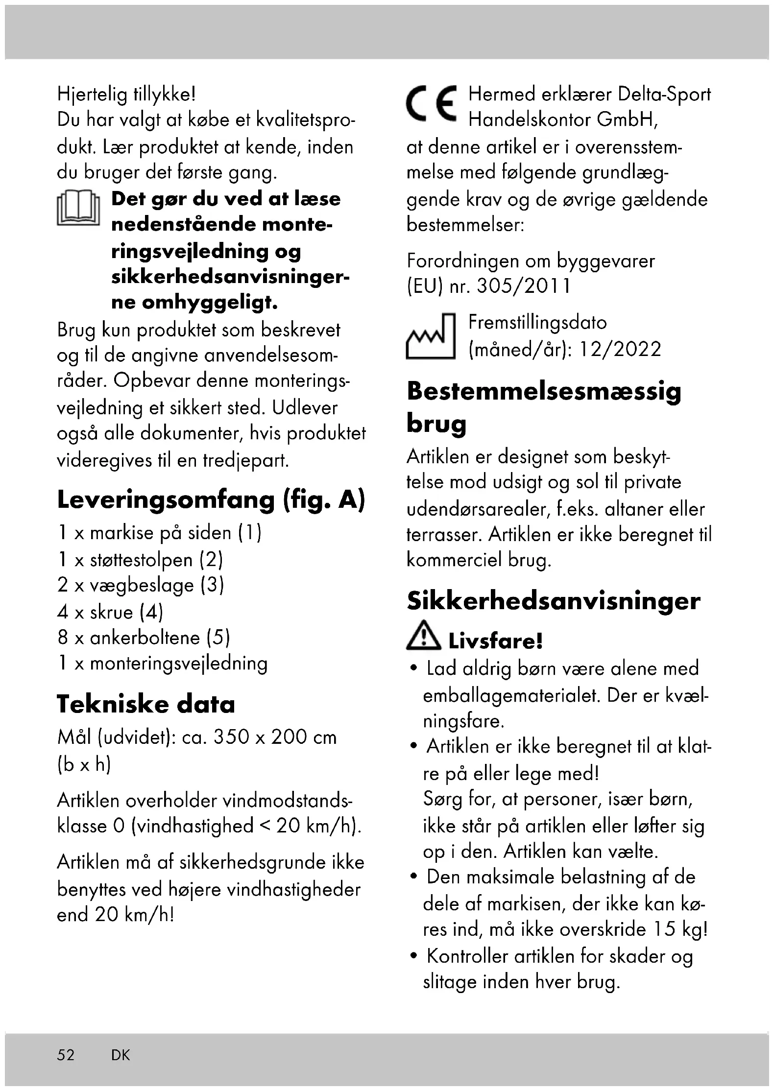 - Betjening ved frost kan beskadige artiklen. Vigtige informationer inden montering ADVARSEL! For at artiklen har optimal stabilitet, s kal gulv- og væg- beslagene skrues godt fast, især på altaner eller på steder, der ikke er i jordplan. Hvis artiklen ikke er skrue t fast på gulv og væg, bortfalder ethvert ansvar fra producentens side.54 ADVARSEL! Montering af artiklen bør på grund af størrelsen gennem- føres af mindst to personer. ADVARSEL! På grund af den nød- vendige brug af værktøj/maskiner er håndværksmæssige færdigheder påkrævet. Egnet monteringsflade Et betonloft eller en bærende træbjælkekonstruktion egner sig til loftsmontering. Et betonfunda- ment eller betonplader på min. 50 x 50 x 5 cm (l x b x d) egner sig til gulvmontering. Bemærk: Hvis du skal fastgøre ar- tiklen på en træbjælkekonstruktion, skal du skrue artiklen fast i denne, da træ ændrer form afhængigt af temperatur- og fugtighed. Spørg om egnede monteringsmaterialer i dit bygg emarked. Bemærk: Andre monteringsforhold skal kontrolleres for bæreevne og styrke af en fagmand. Montering For at montere artiklen skal der bru- ges følgende værktøjer, som ikke er indeholdt i leveringsomfanget: en egnet boremaskine, et målebånd, en egnet skruetrækker, en skruenøgle samt en hammer. Bemærk: For at få et optimal hold på artiklen skal gulv- og vægbesla- gene skrues godt fast. 1. Brug en egnet skruetrækker til at fastgøre vægbeslagene (3) til sidemarkisen (1) med skruerne (4) (afb. B). 2. Vælg en egnet monteringsflade på en væg, og markér fire huller til vægbeslagene (afb. C). 3. Bor 5 cm dybe huller (Ø 8 mm) på de markerede punkter med en boremaskine (afb. C). Vigtigt: Vær sikker på, at det anvendte materiale er egnet til ankerboltene (5). 4. For at montere sidemarkisen på væggen skal ankerboltene hamres ind i de forborede huller. Spænd ankerboltene med en skruenøgle. Bemærk: Ankerbolt ene skal skrues fra hinanden før montering. 5. Vælg en egnet monteringsflade på gulvet, og markér fire huller til støttestolpen (2). Vigtigt: Vær ved valg af placering opmærksom på, at side- markisen og støttes tolpen står på en plan overflade. Støttestolpen må højst monteres 350 cm væk fra sidemarkisen. 6. Bor 5 cm dybe huller (Ø 8 mm) på de markerede punkter med en boremaskine (afb. D). 7. Fastgør støttestolpen med anker- boltene ved at hamre dem ind i de forborede huller med en hammer. DK55 Vigtigt: Sørg for, at støttestolpen er justeret korrekt. 8. Spænd ankerboltene med en skruenøgle. Åbn markisen (afb. E) 1. Hold i håndtaget (1a), og træk det mod støttestolpen. 2. Sæt snaplåsen (1b) (under håndtaget) i den dertil beregnede fordybning på støttestolpen. 3. Sæt markisestangen på snaplåsen (2a) på støttestolpen. Luk markisen (afb. E) 1. Hold i håndtaget, træk det tilbage og løft det. Følg rillen for at låse håndtaget og støttestolpen op. 2. Hold i håndtag et, og flyt det tilba- ge til sidemarkisen. Flyt håndtaget langsomt og vandret. Stoffet træk- ker sig ind i sidemarkisen af sig selv. Opbevaring, rengøring Opbevar altid artiklen tør og ren ved stuetemperatur, når den ikke er i brug. Rengør kun med vand, og tør efter med et viskestykke. VIGTIGT! Må aldrig rengøres med skrappe rengøringsmidler. Lad artik- len tørre, mens den er åben. Vedligeholdelse