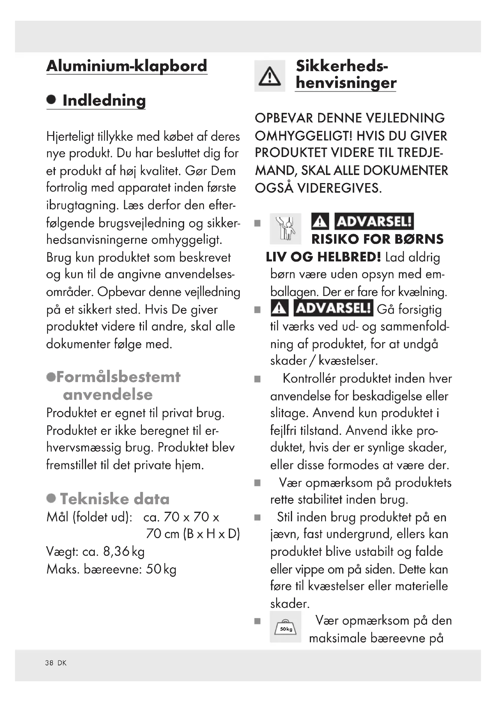 LIV OG HELBRED! Lad aldrig børn være uden opsyn med em- ballagen. Der er fare for kvælning. Gå forsigtig til værks ved ud- og sammenfold- ning af produktet, for at undgå skader / kvæstelser. Kontrollér produktet inden hver anvendelse for beskadigelse eller slitage. Anvend kun produktet i fejlfri tilstand. Anvend ikke pro- duktet, hvis der er synlige skader, eller disse formodes at være der. Vær opmærksom på produktets rette stabilitet inden brug. Stil inden brug produktet på en jævn, fast undergrund, ellers kan produktet blive ustabilt og falde eller vippe om på siden. Dette kan føre til kvæstelser eller materielle skader. 50 kg Vær opmærksom på den maksimale bæreevne på39 DK 50 kg. Hvis denne vægtgrænse overskrides, kan dette føre til personskader og / eller materi- elle skader. Sørg for, at personer, især børn, ikke stiller sig på produktet eller trækker sig op ved hjælp af det. Produktet kan vælte omkuld. Sæt eller stil dig aldrig på pro- duktet. Pas for at undgå skader på at dine hænder ikke kommer ind i sammenklapningsanordningen. Vær ved udfoldningen opmærk- som på, at foldemekanismen går i hak, inden du anvender produktet. Sørg for at produktet er blevet fuldstændig åbnet, inden du anvender det. Produktet er ikke noget legetøj og bør kun anvendes under op- syn af voksne. Produktet er ikke noget klatrestativ eller legetøj. Sikre produktet ved ekstreme vejrforhold, fx ved kraftig blæst. Anvend aldrig produktet i nær- heden af åben ild.