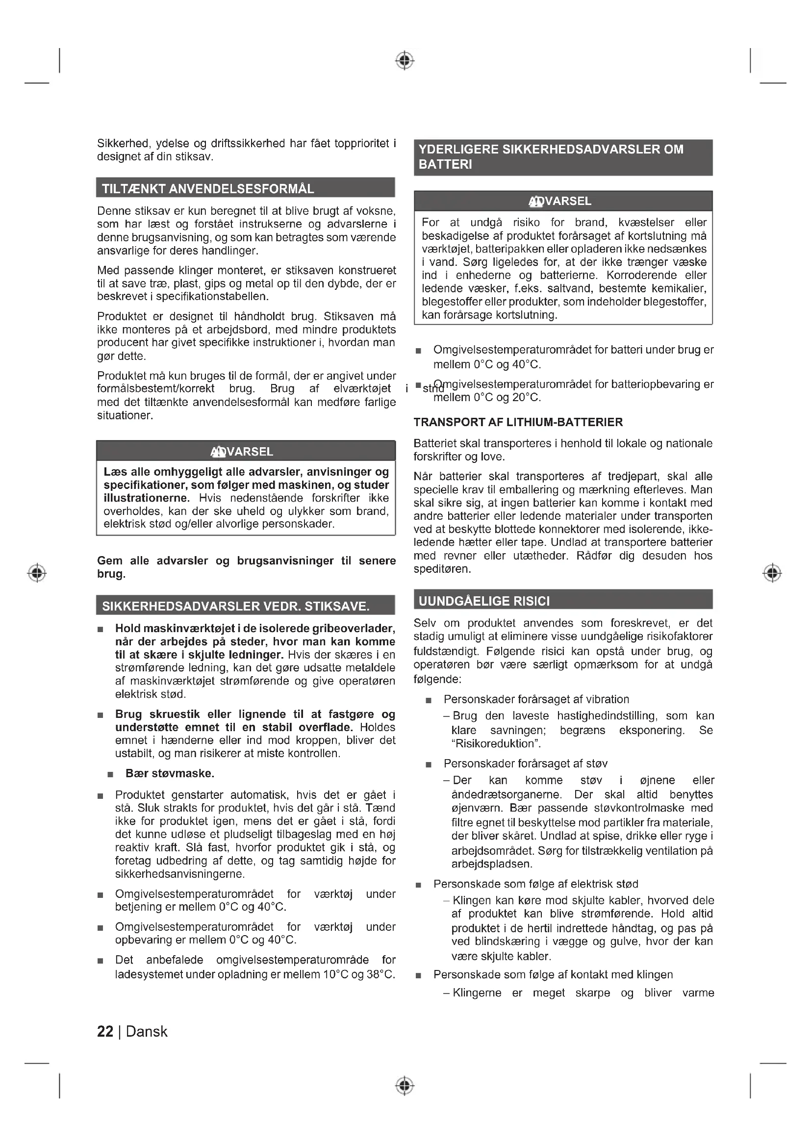 Denne stiksav er kun beregnet til at blive brugt af voksne, som har læst og forstået instrukserne og advarslerne i denne brugsanvisning, og som kan betragtes som værende ansvarlige for deres handlinger. Med passende klinger monteret, er stiksaven konstrueret til at save træ, plast, gips og metal op til den dybde, der er EHVNUHYHWLVSHFL¿NDWLRQVWDEHOOHQ Produktet er designet til håndholdt brug. Stiksaven må ikke monteres på et arbejdsbord, med mindre produktets SURGXFHQWKDUJLYHWVSHFL¿NNHLQVWUXNWLRQHULKYRUGDQPDQ gør dette. Produktet må kun bruges til de formål, der er angivet under IRUPnOVEHVWHPWNRUUHNW EUXJ %UXJ DI HOYUNW¡MHW L VWULG med det tiltænkte anvendelsesformål kan medføre farlige situationer. ADVARSEL Læs alle omhyggeligt alle advarsler, anvisninger og specifikationer, som følger med maskinen, og studer illustrationerne. Hvis nedenstående forskrifter ikke overholdes, kan der ske uheld og ulykker som brand, HOHNWULVNVW¡GRJHOOHUDOYRUOLJHSHUVRQVNDGHU Gem alle advarsler og brugsanvisninger til senere brug. SIKKERHEDSADVARSLER VEDR. STIKSAVE. Ŷ Hold maskinværktøjet i de isolerede gribeoverlader, når der arbejdes på steder, hvor man kan komme til at skære i skjulte ledninger. Hvis der skæres i en strømførende ledning, kan det gøre udsatte metaldele af maskinværktøjet strømførende og give operatøren elektrisk stød. Ŷ Brug skruestik eller lignende til at fastgøre og understøtte emnet til en stabil overflade. Holdes emnet i hænderne eller ind mod kroppen, bliver det ustabilt, og man risikerer at miste kontrollen. Ŷ Bær støvmaske. Ŷ Produktet genstarter automatisk, hvis det er gået i stå. Sluk strakts for produktet, hvis det går i stå. Tænd ikke for produktet igen, mens det er gået i stå, fordi det kunne udløse et pludseligt tilbageslag med en høj reaktiv kraft. Slå fast, hvorfor produktet gik i stå, og foretag udbedring af dette, og tag samtidig højde for sikkerhedsanvisningerne. Ŷ Omgivelsestemperaturområdet for værktøj under betjening er mellem 0°C og 40°C. Ŷ Omgivelsestemperaturområdet for værktøj under opbevaring er mellem 0°C og 40°C. Ŷ Det anbefalede omgivelsestemperaturområde for ladesystemet under opladning er mellem 10°C og 38°C.