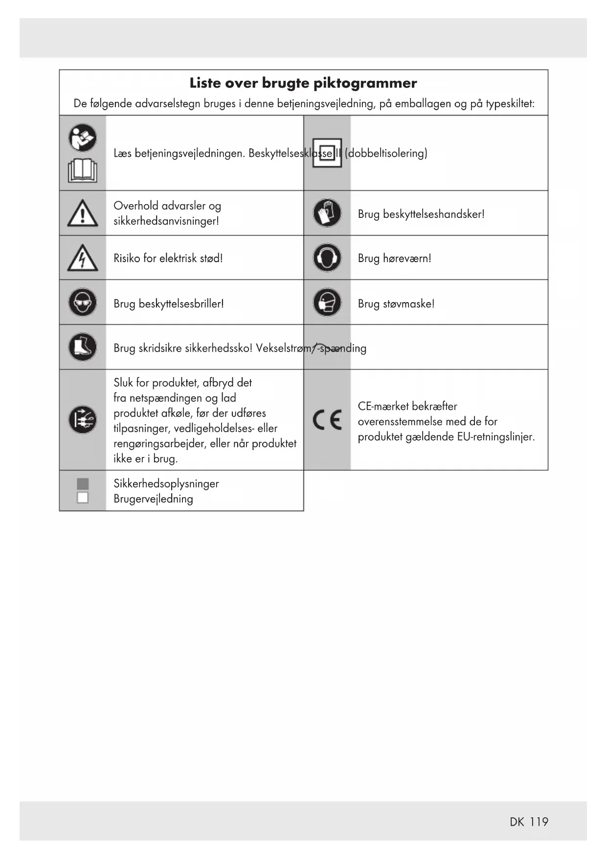 Liste over brugte piktogrammer De følgende advarselstegn bruges i denne betjeningsvejledning, på emballagen og på typeskiltet: Læs betjeningsvejledningen. BeskyttelsesklasseII (dobbeltisolering) Overhold advarsler og sikkerhedsanvisninger! Brug beskyttelseshandsker! Risiko for elektrisk stød!