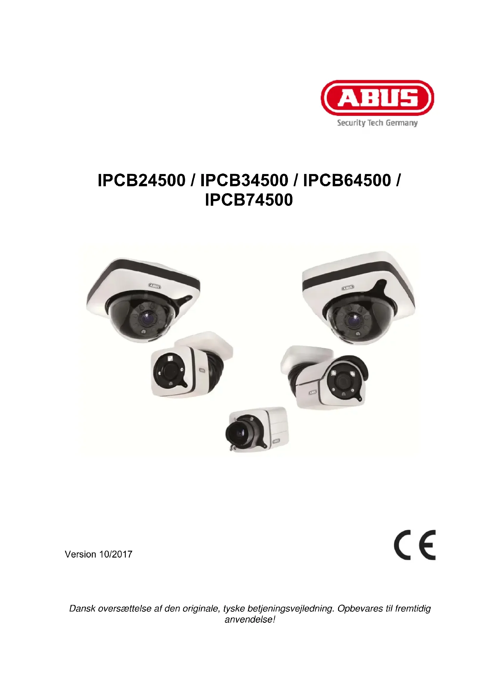 Kære kunde Tak, fordi du har valgt at købe dette produkt. IPCB24500 Udstyret opfylder desuden kravene i følgende EU-direktiver: EMC-direktiv 2014/30/EU samt RoHS-direktiv 2011/65/EU. Den fulde tekst fra EU-overensstemmelseserklæringen findes på følgende internetadresse: www.abus.com/product/IPCB24500 IPCB34500 Udstyret opfylder desuden kravene i følgende EU-direktiver: EMC-direktiv 2014/30/EU samt RoHS-direktiv 2011/65/EU. Den fulde tekst fra EU-overensstemmelseserklæringen findes på følgende internetadresse: www.abus.com/product/IPCB34500 IPCB64500 Udstyret opfylder desuden kravene i følgende EU-direktiver: EMC-direktiv 2014/30/EU samt RoHS-direktiv 2011/65/EU. Den fulde tekst fra EU-overensstemmelseserklæringen findes på følgende internetadresse: www.abus.com/product/IPCB64500 IPCB74500 Udstyret opfylder desuden kravene i følgende EU-direktiver: EMC-direktiv 2014/30/EU samt RoHS-direktiv 2011/65/EU. Den fulde tekst fra EU-overensstemmelseserklæringen findes på følgende internetadresse: www.abus.com/product/IPCB74500