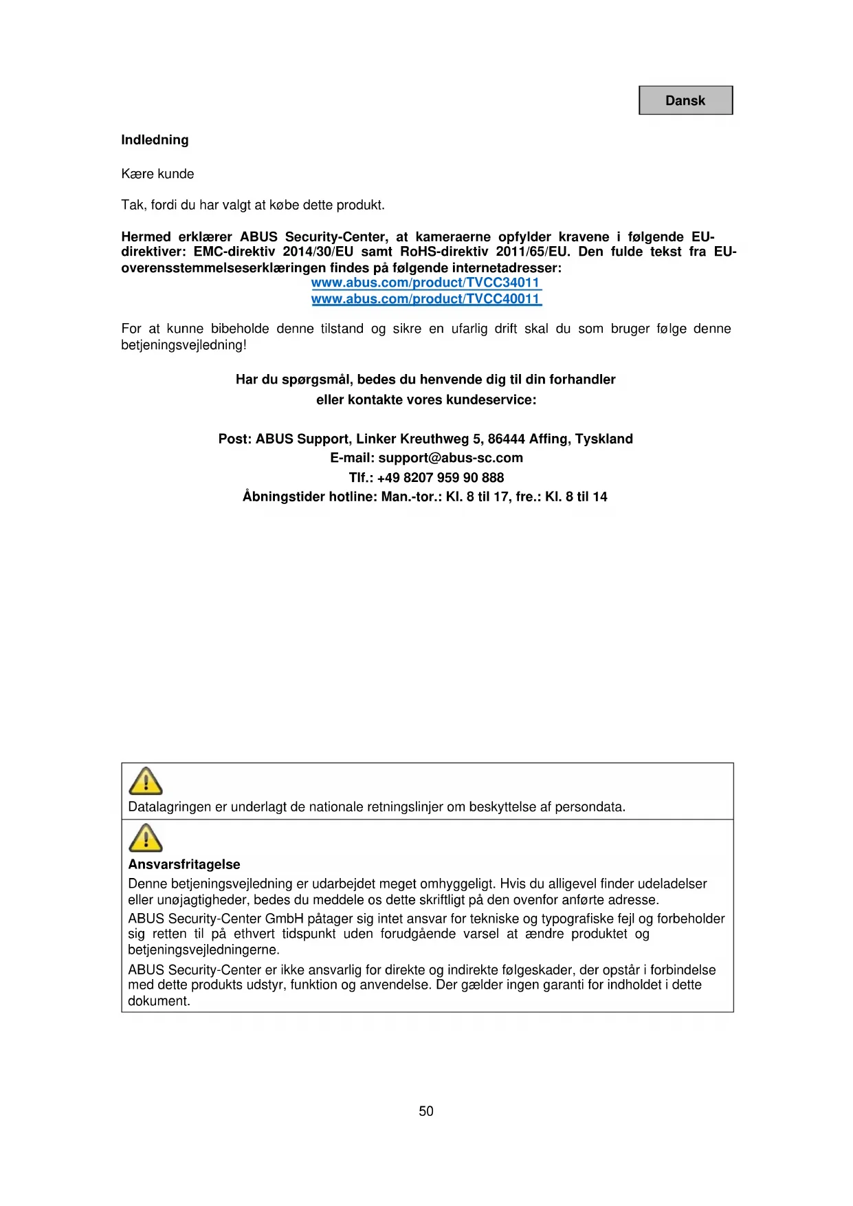 Ansvarsfritagelse Denne betjeningsvejledning er udarbejdet meget omhyggeligt. Hvis du alligevel finder udeladelser eller unøjagtigheder, bedes du meddele os dette skriftligt på den ovenfor anførte adresse. ABUS Security-Center GmbH påtager sig intet ansvar for tekniske og typografiske fejl og forbeholder sig retten til på ethvert tidspunkt uden forudgående varsel at ændre produktet og betjeningsvejledningerne. ABUS Security-Center er ikke ansvarlig for direkte og indirekte følgeskader, der opstår i forbindelse med dette produkts udstyr, funktion og anvendelse. Der gælder ingen garanti for indholdet i dette dokument.51 Dansk Symbolforklaring