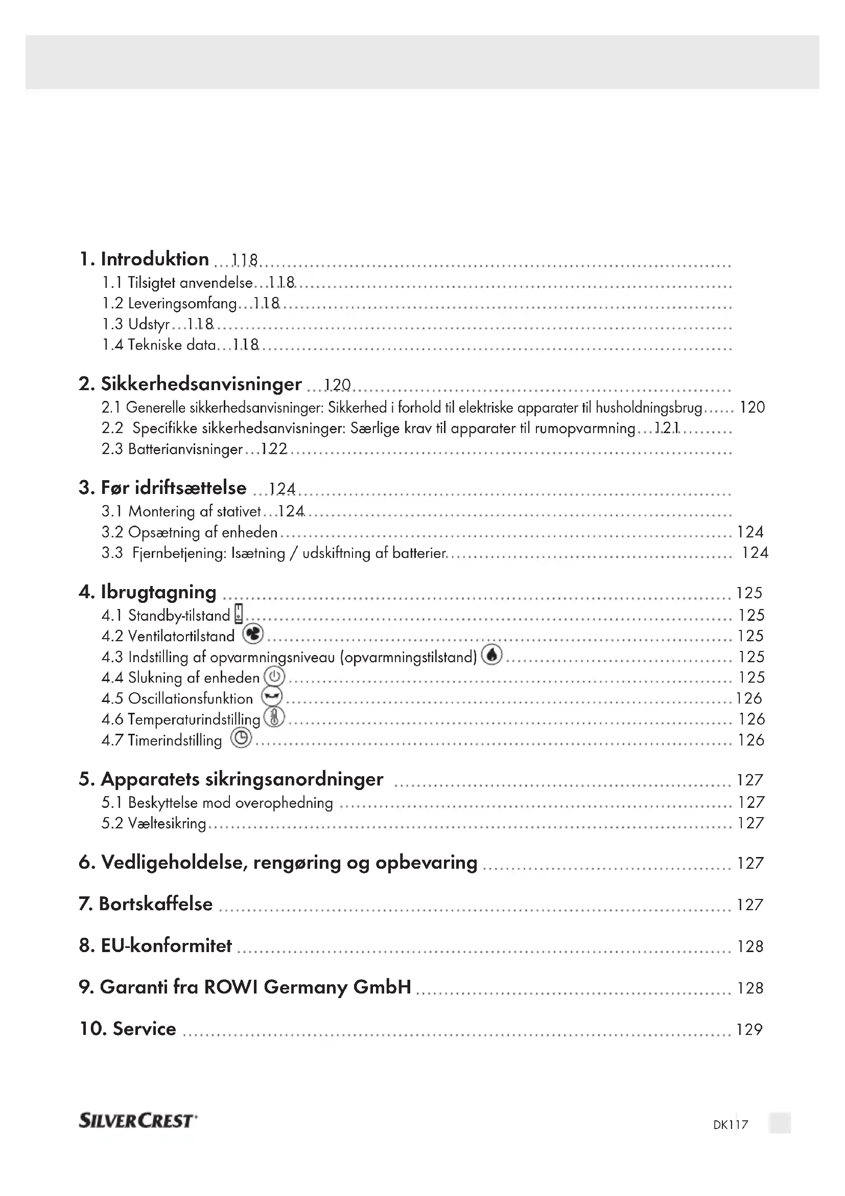 Særlige krav til apparater til rumopvarmning ADVARSEL! Må ikke tildækkes! For at undgå en overophedning af varmeapparatet må varme- apparatet ikke tildækkes. Varmeapparatet må ikke placeres umiddelbart under en stikkon- takt i væggen. Dette varmeapparat må ikke anvendes i umiddelbar nærhed af et badekar, en bruser eller et svømmebassin. Et apparat, der er faldet på gulvet, må ikke tages i brug. Anvend ikke, hvis apparatet viser tydelige tegn på beskadigelse. Varmeapparatet skal placeres på et fast, fladt og plant gulv. ADVARSEL! Varmeapparatet må ikke anvendes i små rum, som bebos af mennesker, der ikke kan forlade rummet uden hjælp, med mindre konstant overvågning er sikret. ADVARSEL! Brandfare! For at mindske brandfaren bedes du holde tekstiler, forhæng, gardiner og andet brændbart materiale mindst 1 m fra luftafgangen. Børn under 3 år skal holdes væk, medmindre de er under konstant overvågning. Børn over 3 år eller under 8 år må kun tænde og slukke apparatet, hvis de er under opsyn eller er blevet undervist i sikker brug af ap- paratet og har forstået de eksisterende farer, under forudsætning af, at apparatet er placeret eller installeret i sin normale brugspo- sition. Børn fra 3 år og under 8 år må ikke tilslutte apparatet til stikkontakten, ikke regulere apparatet, ikke rengøre apparatet og/ eller udføre brugervedligeholdelse.DK122 Advarsel om varme overflader! FORSIGTIG: Nogle af produktets dele kan blive meget var- me og forårsage forbrændinger. Der skal udvises særlig forsigtighed, når der er børn og sårbare personer til stede. Apparatet er kun beregnet til indendørsbrug! Livsfare på grund af elektrisk strøm! Livsfare ved kontakt med strømførende ledninger eller komponenter!